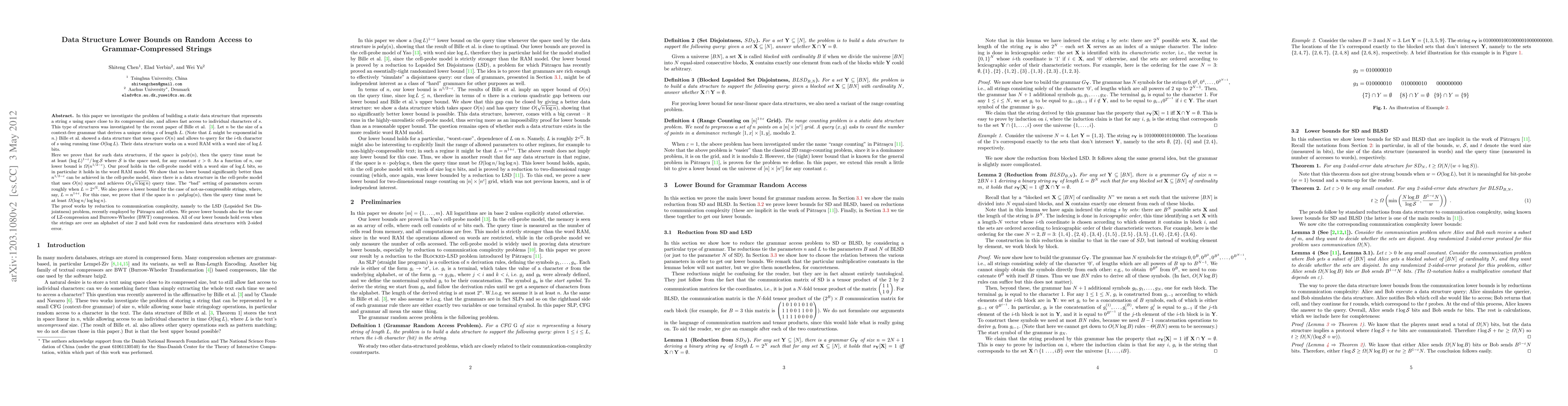 This paper establishes lower bounds for data structures that allow fast access to characters in grammar-compressed strings while maintaining space efficiency. It proves that any structure using poly(n) space must have a query time of at least Ω((log L)^(1-ε)/log S) for any ε > 0, where L is the string length and S is the space used. The lower bound is shown to be Ω(n^(1/2-ε)) as a function of n.