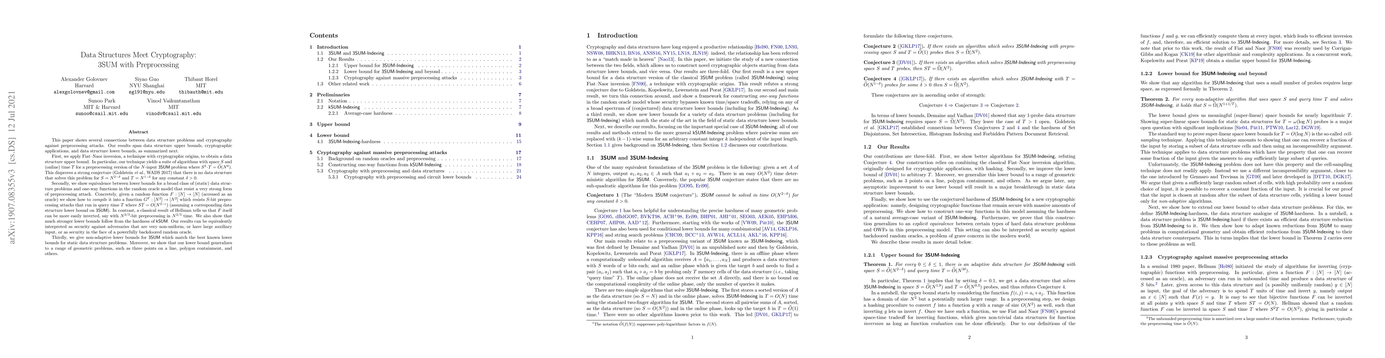 This paper establishes connections between data structure problems and cryptographic resistance to preprocessing attacks, disproving a conjecture on the 3SUM problem and showing equivalence between data structure lower bounds and secure one-way functions against strong preprocessing attacks. The results also provide non-adaptive lower bounds for 3SUM and related geometric problems.