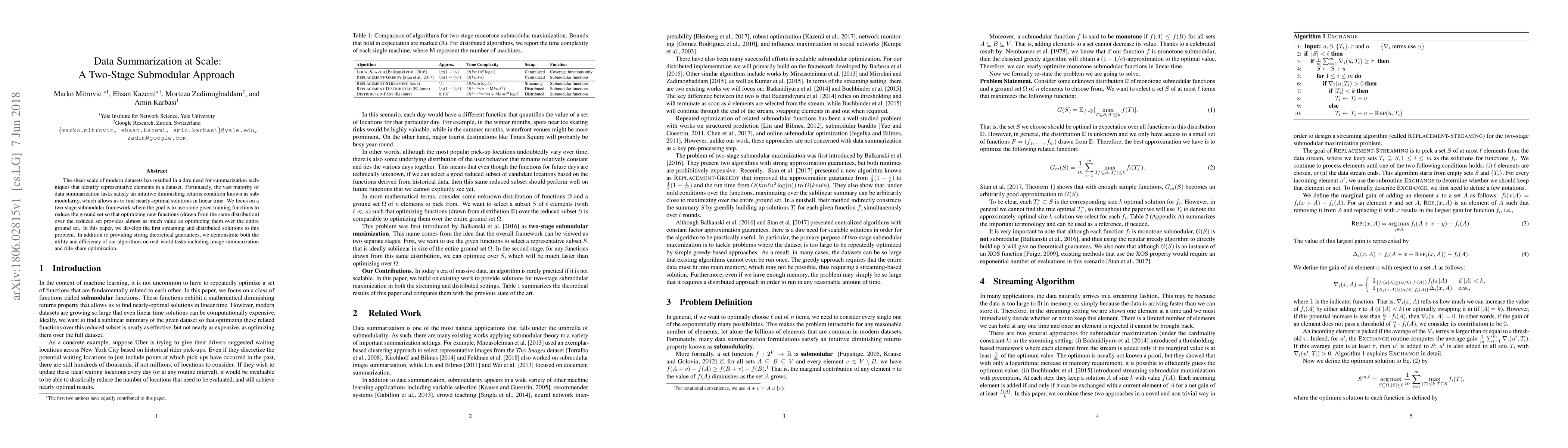 This paper proposes a two-stage submodular approach to data summarization at scale, offering strong theoretical guarantees and demonstrating its utility and efficiency on real-world tasks like image summarization and ride-share optimization.