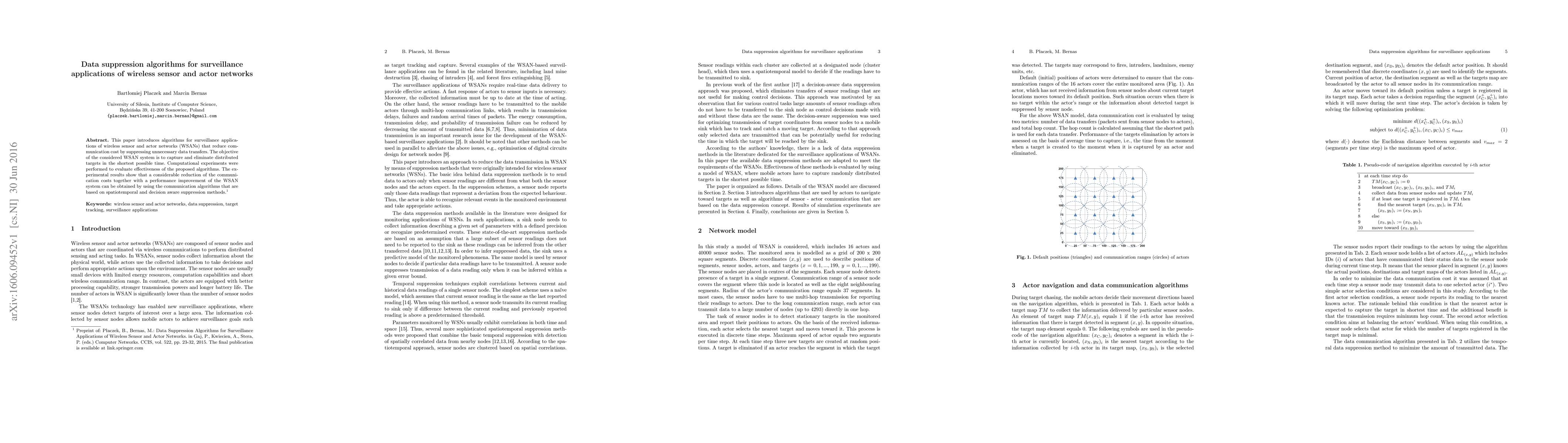 This paper proposes algorithms for surveillance in wireless sensor and actor networks (WSANs) that minimize communication costs by suppressing unnecessary data. Experiments demonstrate significant reductions in communication costs and improved performance through spatiotemporal and decision-aware suppression methods.