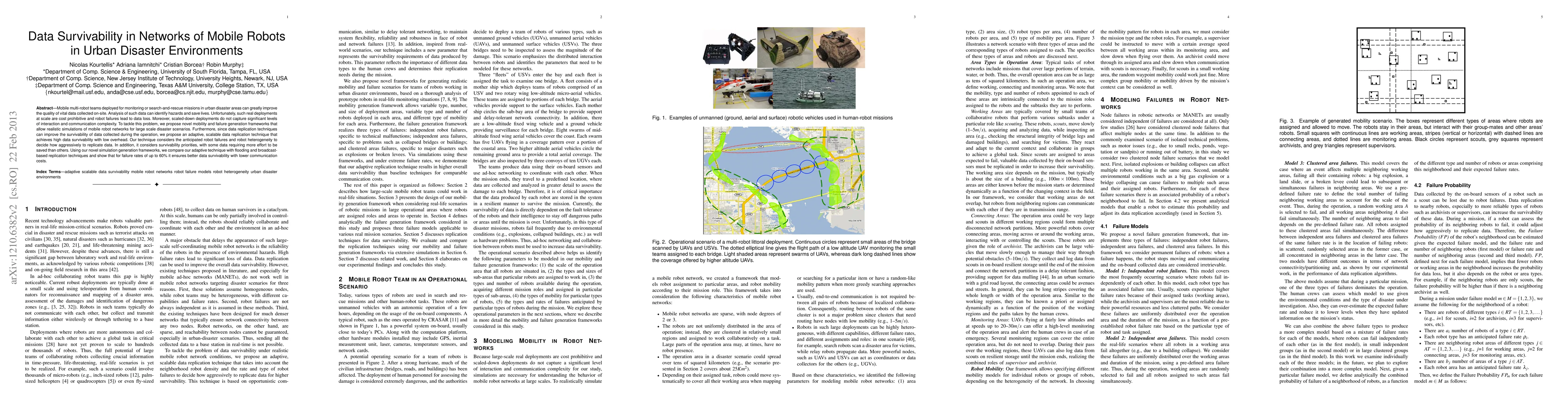 Mobile multi-robot teams deployed for monitoring or search-and-rescue missions in urban disaster areas can greatly improve the quality of vital data collected on-site. Analysis of such data can identify hazards and save lives. Unfortunately, such real deployments at scale are cost prohibitive and robot failures lead to data loss. Moreover, scaled-down deployments do not capture significant levels of interaction and communication complexity. To tackle this problem, we propose novel mobility and failure generation frameworks that allow realistic simulations of mobile robot networks for large scale disaster scenarios. Furthermore, since data replication techniques can improve the survivability of data collected during the operation, we propose an adaptive, scalable data replication technique that achieves high data survivability with low overhead. Our technique considers the anticipated robot failures and robot heterogeneity to decide how aggressively to replicate data. In addition, it considers survivability priorities, with some data requiring more effort to be saved than others. Using our novel simulation generation frameworks, we compare our adaptive technique with flooding and broadcast-based replication techniques and show that for failure rates of up to 60% it ensures better data survivability with lower communication costs.