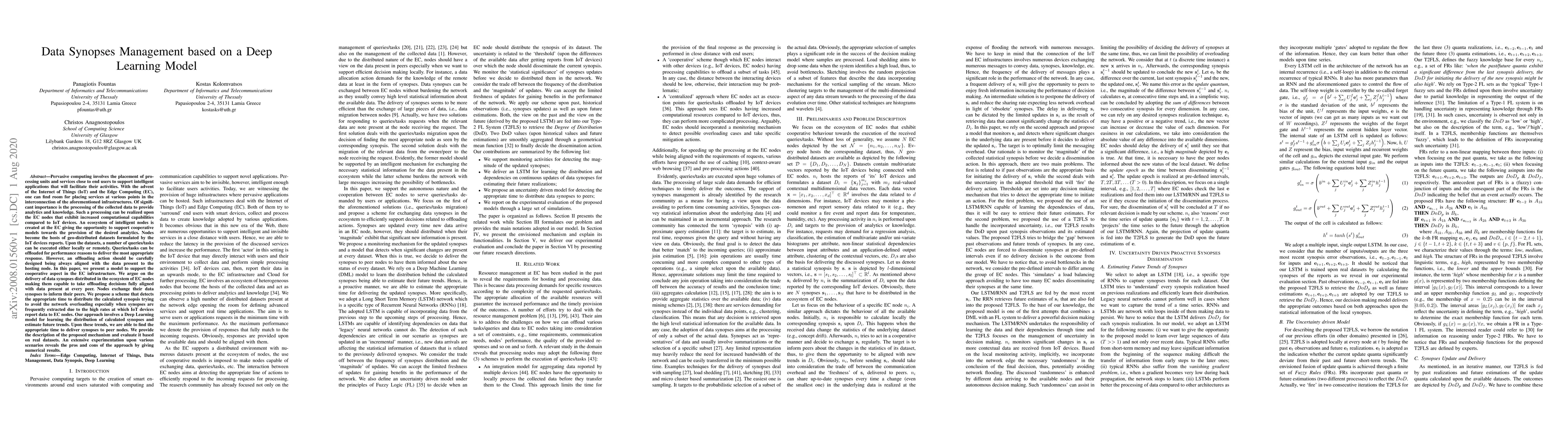 This paper proposes a deep learning model for managing data synopses in edge computing to support cooperative models. It aims to optimize the distribution of synopses to EC nodes, ensuring offloading decisions are aligned with available data, while avoiding network overload. The model learns synopses distribution and predicts optimal delivery times, evaluated through real datasets and various scenarios.