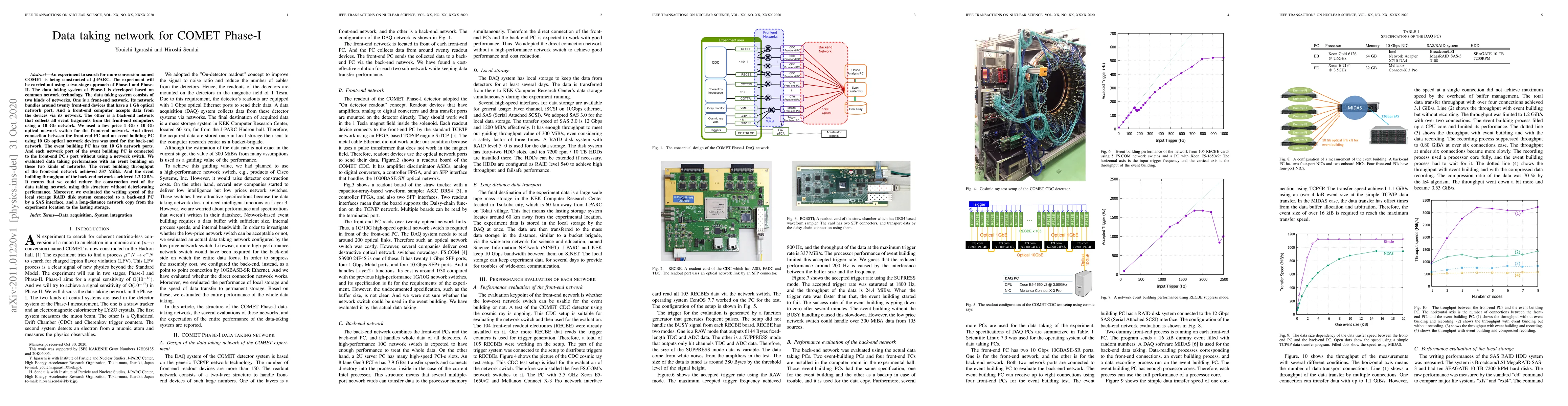 The COMET Phase-I experiment at J-PARC uses a two-stage data taking system with a front-end network of 1-Gb optical connections and a back-end network of direct 10-Gb connections. This setup achieves high event building throughputs of 337 MiB/s and 1.2 GiB/s respectively, demonstrating cost-effectiveness without performance loss. Additionally, the paper evaluates local storage and long-distance network copy speeds.