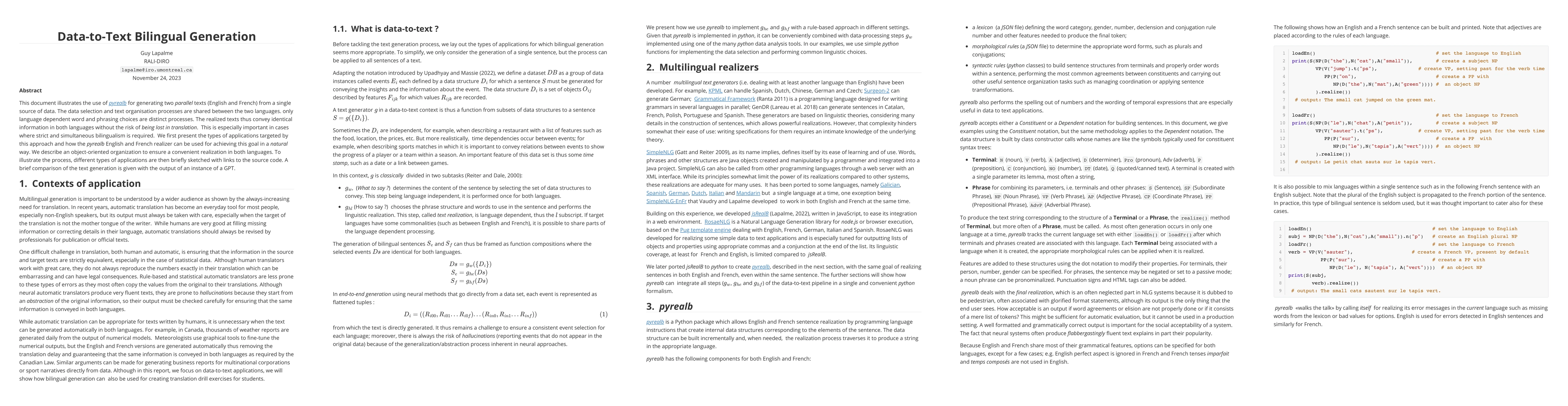 This paper explores the use of pyrealb for generating parallel English and French texts from a single data source, ensuring identical information across languages. It highlights the application of an object-oriented approach to facilitate bilingual text generation while maintaining translation accuracy.
