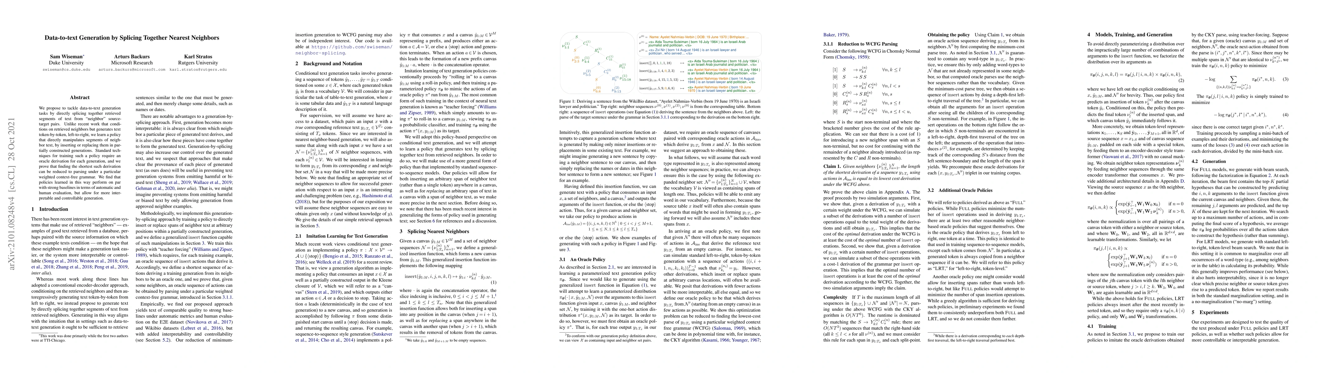 We propose to tackle data-to-text generation tasks by directly splicing together retrieved segments of text from "neighbor" source-target pairs. Unlike recent work that conditions on retrieved neighbors but generates text token-by-token, left-to-right, we learn a policy that directly manipulates segments of neighbor text, by inserting or replacing them in partially constructed generations. Standard techniques for training such a policy require an oracle derivation for each generation, and we prove that finding the shortest such derivation can be reduced to parsing under a particular weighted context-free grammar. We find that policies learned in this way perform on par with strong baselines in terms of automatic and human evaluation, but allow for more interpretable and controllable generation.