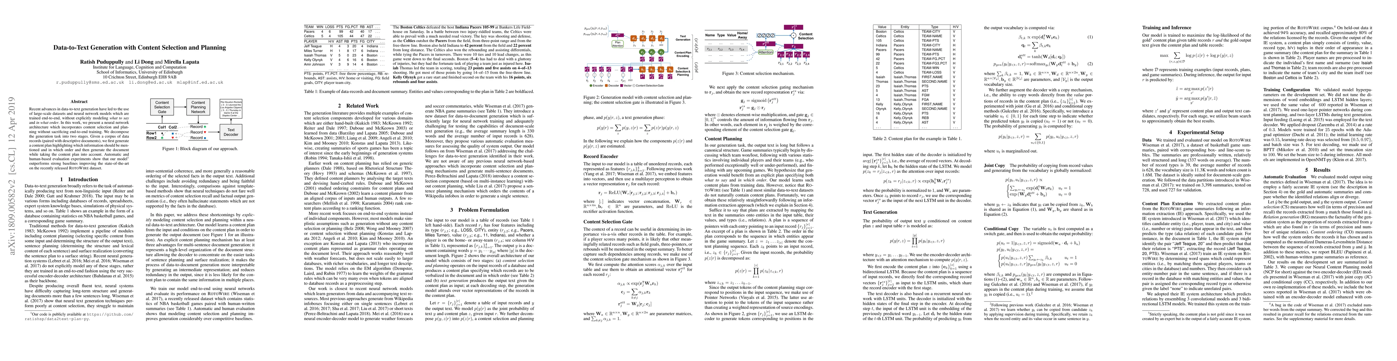 This paper introduces a neural network architecture for data-to-text generation that incorporates content selection and planning, achieving superior performance compared to baselines. The model first generates a content plan, then uses it to guide the document generation, outperforming existing methods on the RotoWire dataset.
