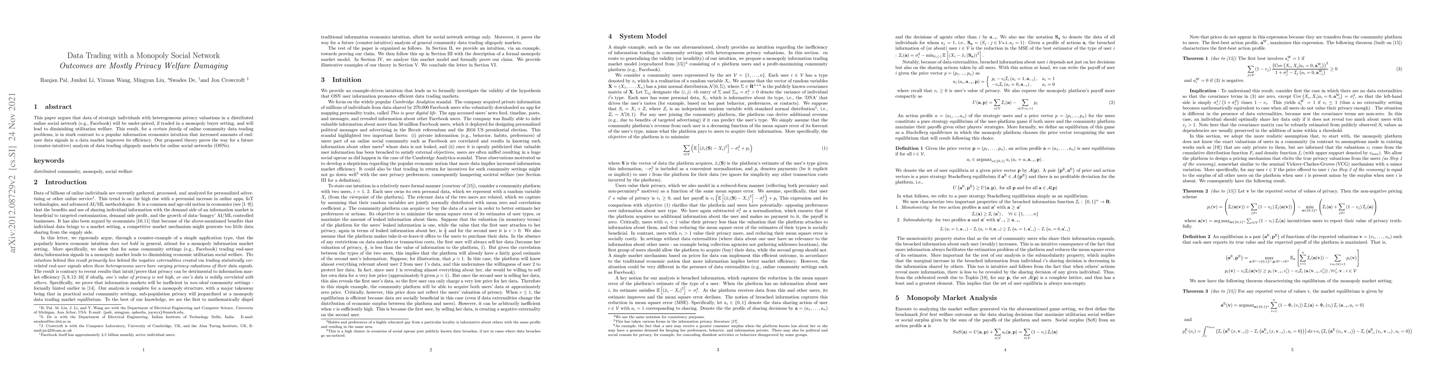 This paper demonstrates that data from strategic individuals in a monopoly social network is under-priced, leading to reduced utilitarian welfare and privacy concerns, contrary to the belief that more data improves market efficiency. The findings suggest a need for further analysis of data trading in oligopoly markets for online social networks.