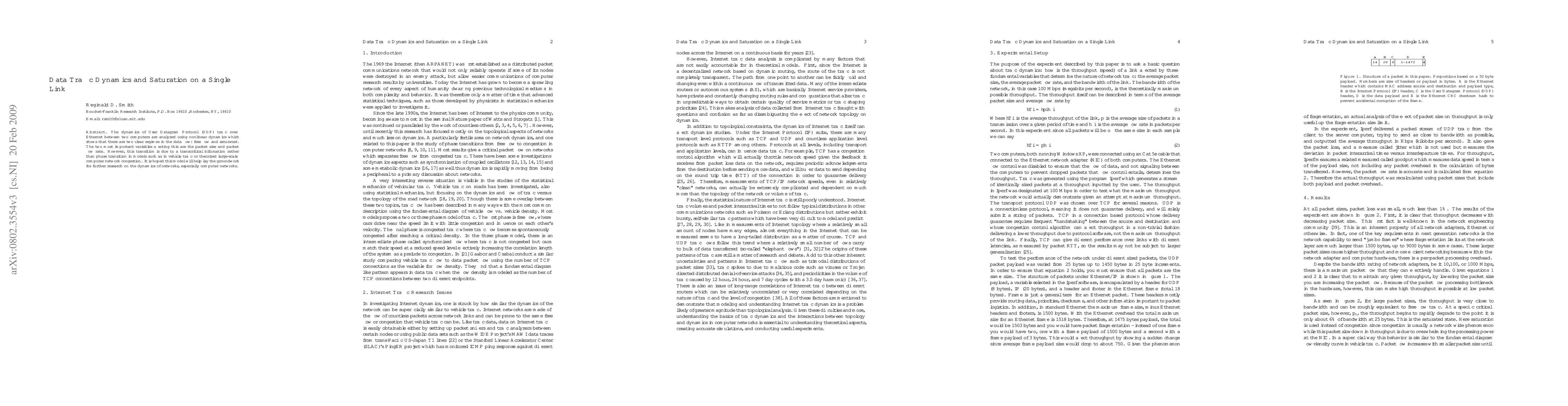 The dynamics of User Datagram Protocol (UDP) traffic over Ethernet between two computers are analyzed using nonlinear dynamics which shows that there are two clear regimes in the data flow: free flow and saturated. The two most important variables affecting this are the packet size and packet flow rate. However, this transition is due to a transcritical bifurcation rather than phase transition in models such as in vehicle traffic or theorized large-scale computer network congestion. It is hoped this model will help lay the groundwork for further research on the dynamics of networks, especially computer networks.