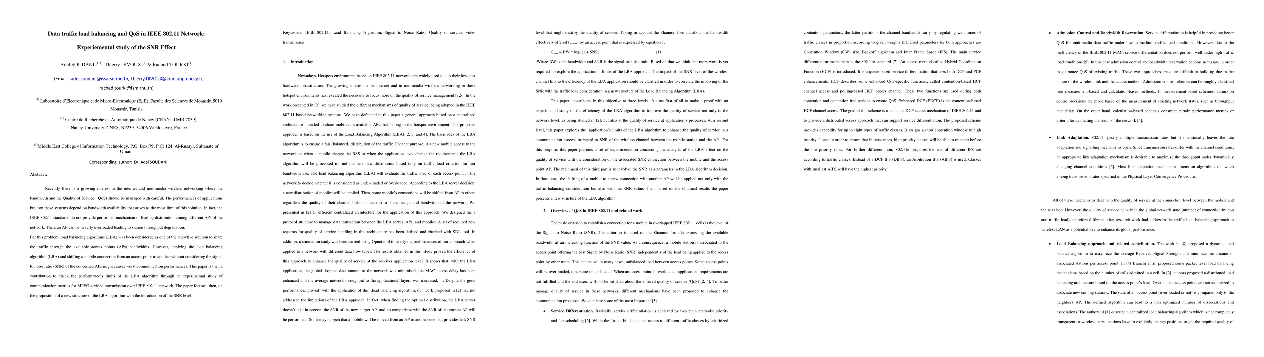 This paper investigates the impact of signal strength on data traffic load balancing and quality of service in IEEE 802.11 networks, proposing a new load balancing algorithm that considers received signal strength to improve communication performance for multimedia applications. Experimental results demonstrate the effectiveness of the proposed algorithm in mitigating throughput degradation caused by overloaded access points.