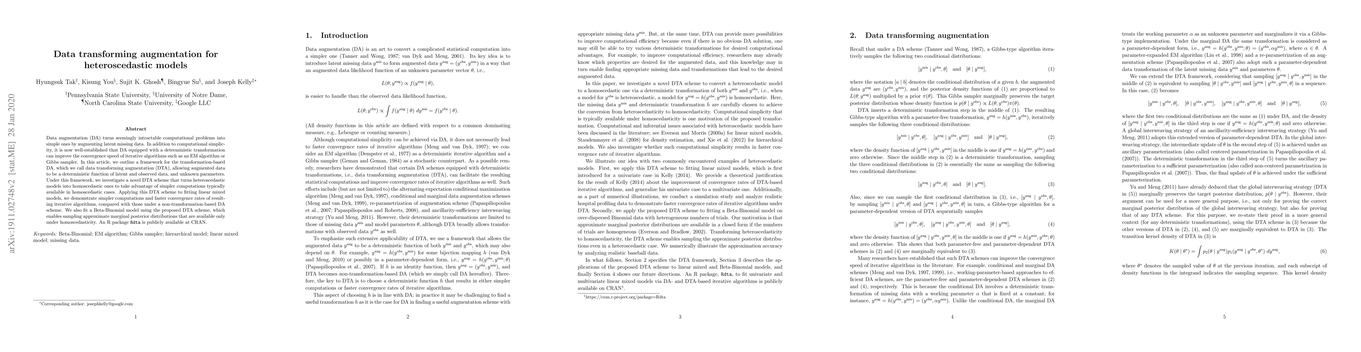 This paper proposes a data transforming augmentation (DTA) framework to simplify computations in heteroscedastic models by converting them to homoscedastic ones. The DTA scheme demonstrates faster convergence rates and simpler computations in fitting linear mixed models and Beta-Binomial models, with an R package, Rdta, available for implementation.