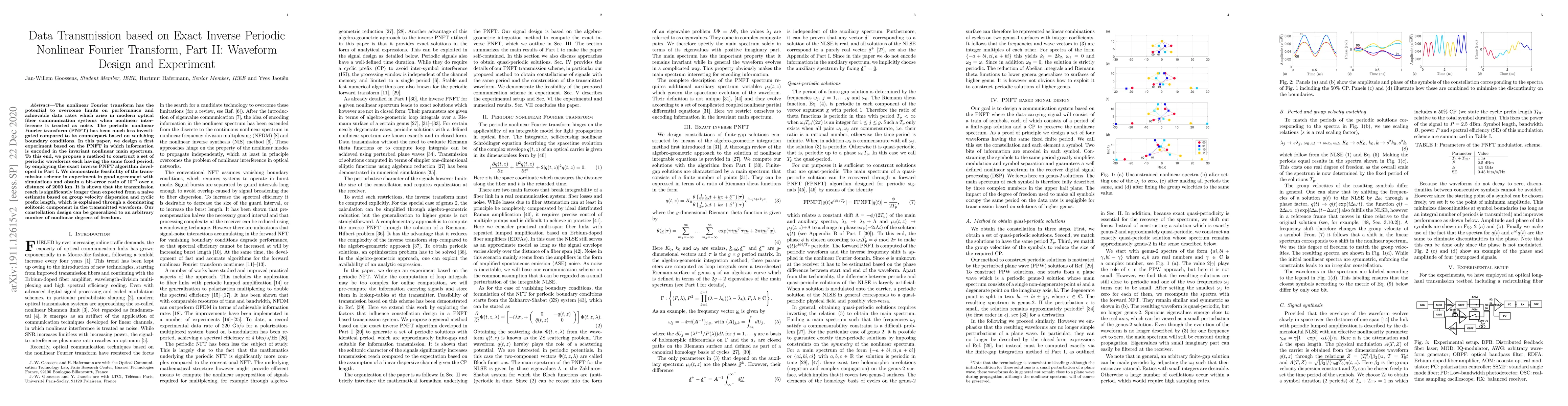 This paper proposes a method for constructing periodic waveforms using the exact inverse periodic nonlinear Fourier transform for optical fiber communication, demonstrating successful data transmission over 2000 km with a bit-error ratio of $10^{-3}$, significantly exceeding expectations due to a dominant solitonic component.