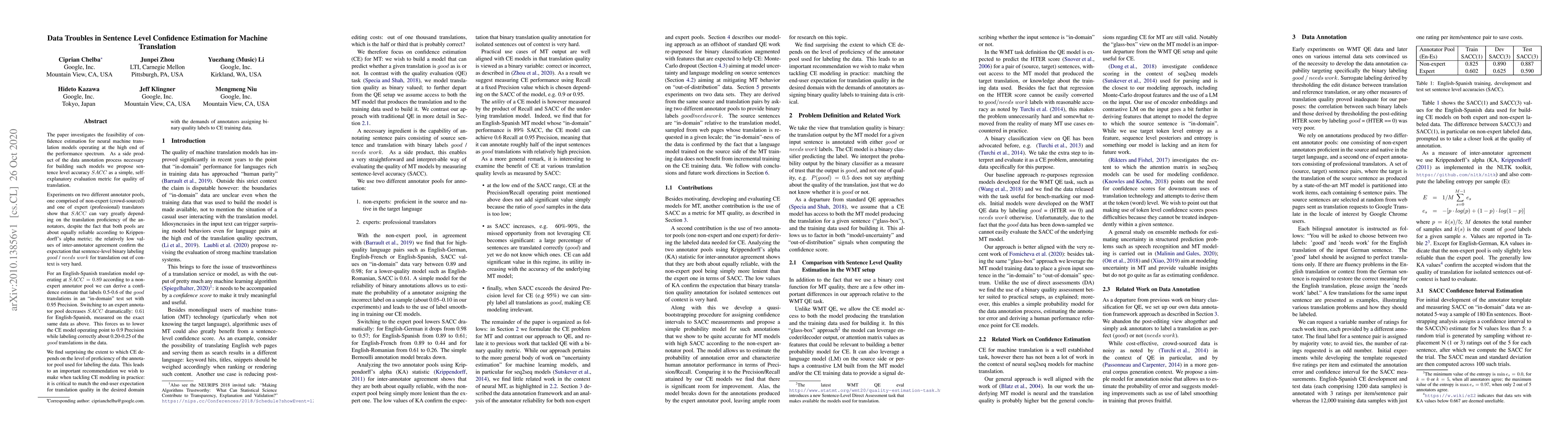 The paper investigates the feasibility of confidence estimation for neural machine translation models operating at the high end of the performance spectrum. As a side product of the data annotation process necessary for building such models we propose sentence level accuracy $SACC$ as a simple, self-explanatory evaluation metric for quality of translation. Experiments on two different annotator pools, one comprised of non-expert (crowd-sourced) and one of expert (professional) translators show that $SACC$ can vary greatly depending on the translation proficiency of the annotators, despite the fact that both pools are about equally reliable according to Krippendorff's alpha metric; the relatively low values of inter-annotator agreement confirm the expectation that sentence-level binary labeling $good$ / $needs\ work$ for translation out of context is very hard. For an English-Spanish translation model operating at $SACC = 0.89$ according to a non-expert annotator pool we can derive a confidence estimate that labels 0.5-0.6 of the $good$ translations in an "in-domain" test set with 0.95 Precision. Switching to an expert annotator pool decreases $SACC$ dramatically: $0.61$ for English-Spanish, measured on the exact same data as above. This forces us to lower the CE model operating point to 0.9 Precision while labeling correctly about 0.20-0.25 of the $good$ translations in the data. We find surprising the extent to which CE depends on the level of proficiency of the annotator pool used for labeling the data. This leads to an important recommendation we wish to make when tackling CE modeling in practice: it is critical to match the end-user expectation for translation quality in the desired domain with the demands of annotators assigning binary quality labels to CE training data.