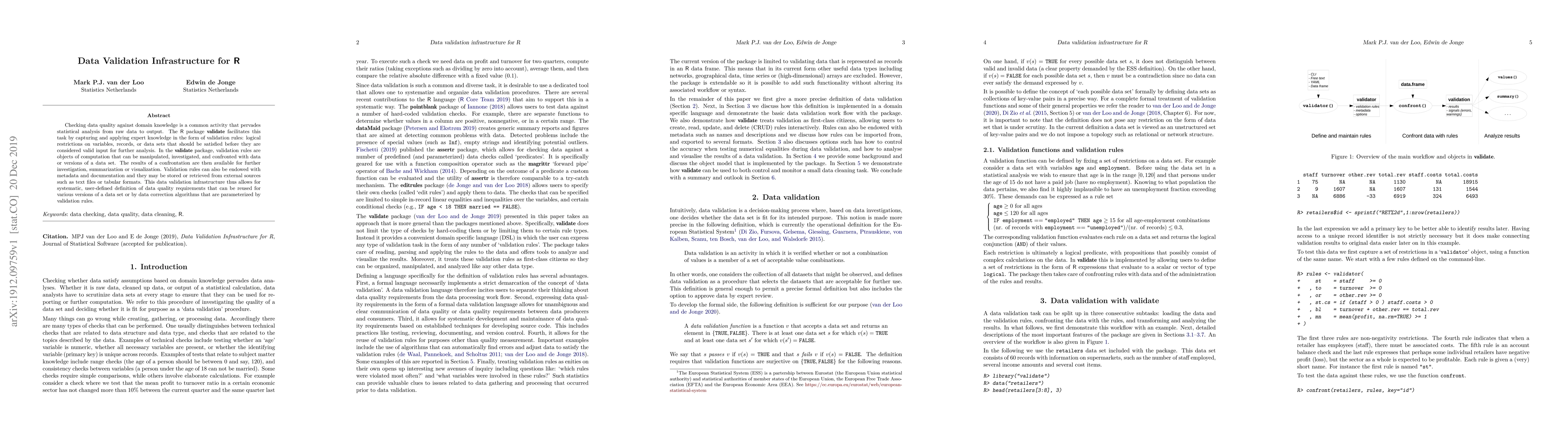 Checking data quality against domain knowledge is a common activity that pervades statistical analysis from raw data to output. The R package 'validate' facilitates this task by capturing and applying expert knowledge in the form of validation rules: logical restrictions on variables, records, or data sets that should be satisfied before they are considered valid input for further analysis. In the validate package, validation rules are objects of computation that can be manipulated, investigated, and confronted with data or versions of a data set. The results of a confrontation are then available for further investigation, summarization or visualization. Validation rules can also be endowed with metadata and documentation and they may be stored or retrieved from external sources such as text files or tabular formats. This data validation infrastructure thus allows for systematic, user-defined definition of data quality requirements that can be reused for various versions of a data set or by data correction algorithms that are parameterized by validation rules.