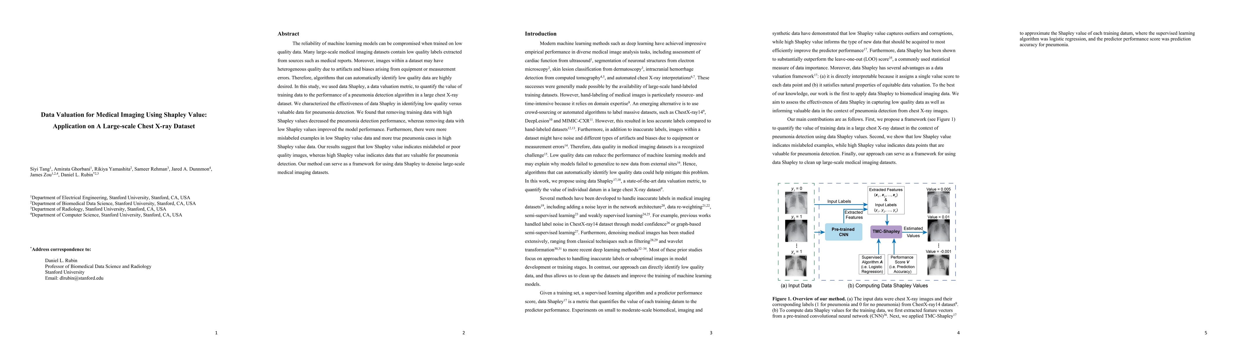 This study employs data Shapley value to assess the contribution of training data to a pneumonia detection model on a large chest X-ray dataset. The findings indicate that high Shapley value data are valuable for model performance, while low Shapley value data often contain mislabels or poor quality images, suggesting a method for improving dataset quality.