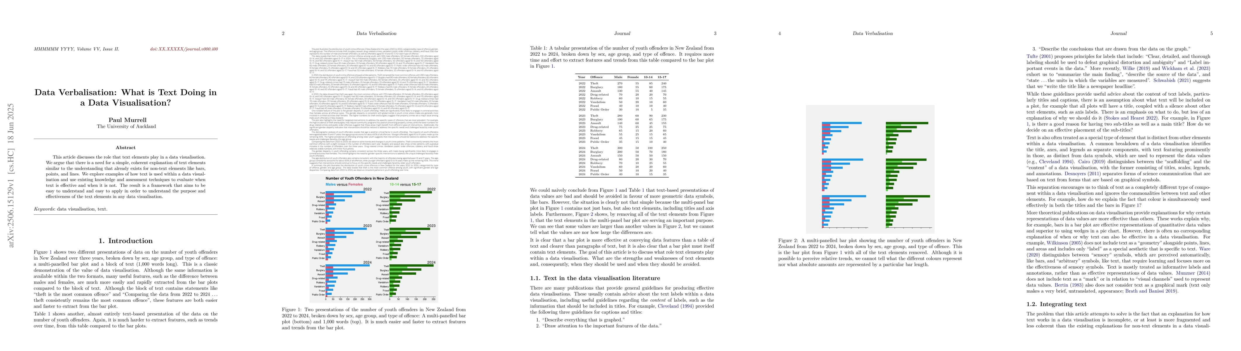 This article discusses the role that text elements play in a data visualisation. We argue that there is a need for a simple, coherent explanation of text elements similar to the understanding that already exists for non-text elements like bars, points, and lines. We explore examples of how text is used within a data visualisation and use existing knowledge and assessment techniques to evaluate when text is effective and when it is not. The result is a framework that aims to be easy to understand and easy to apply in order to understand the purpose and effectiveness of the text elements in any data visualisation.