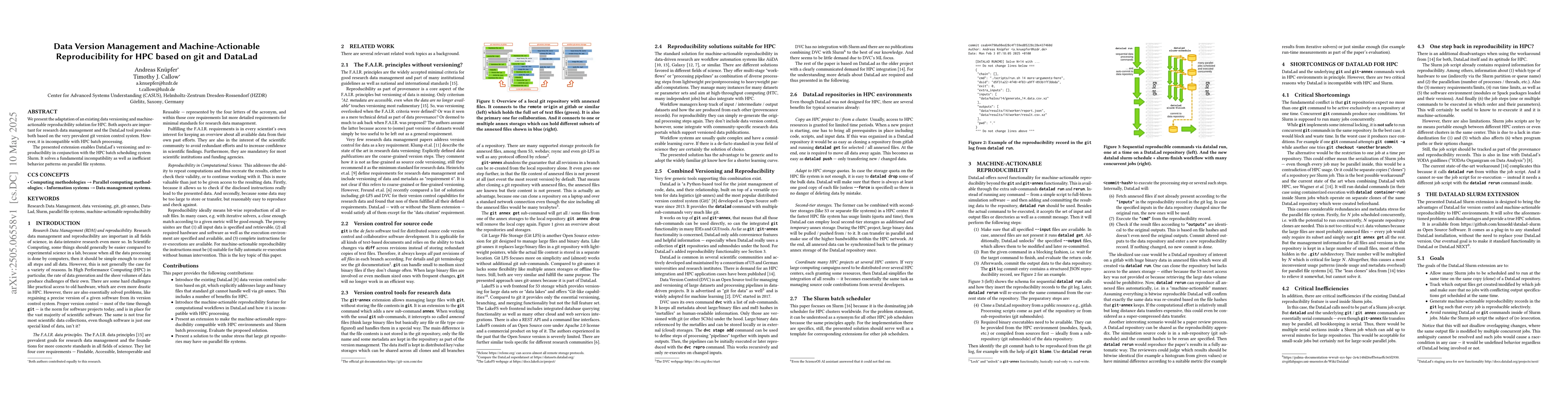 The research adapts the DataLad tool, which provides data versioning and machine-actionable reproducibility based on the git system, to be compatible with HPC batch processing using the Slurm scheduling system.
