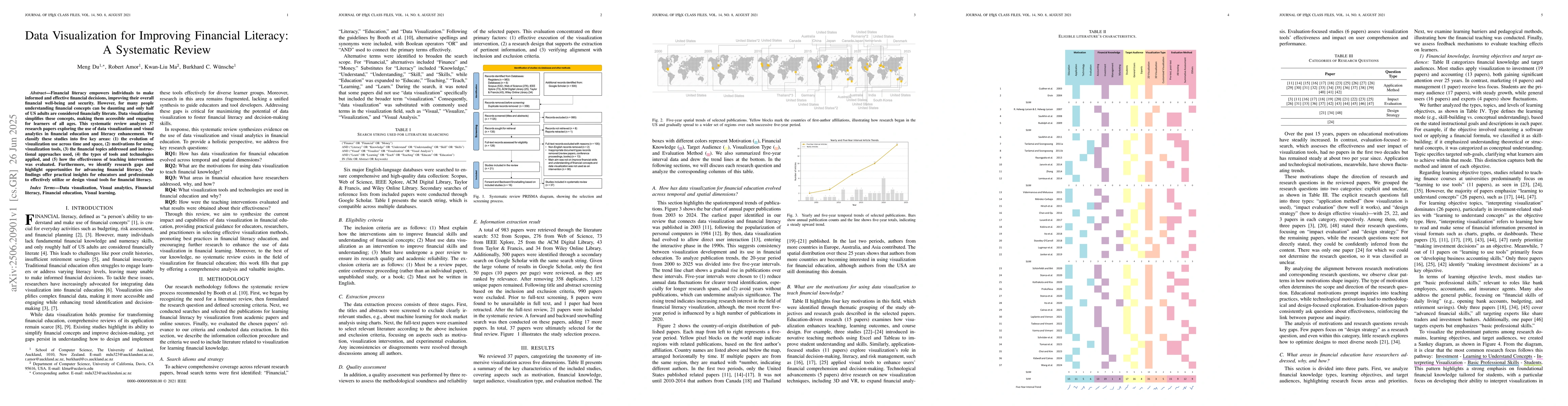 This systematic review of 37 research papers explores the use of data visualization in financial education, categorizing studies into five key areas: historical context, motivations, financial topics, tools, and effectiveness evaluation. It identifies gaps and suggests opportunities for enhancing financial literacy through visual tools, offering practical insights for educators and professionals.