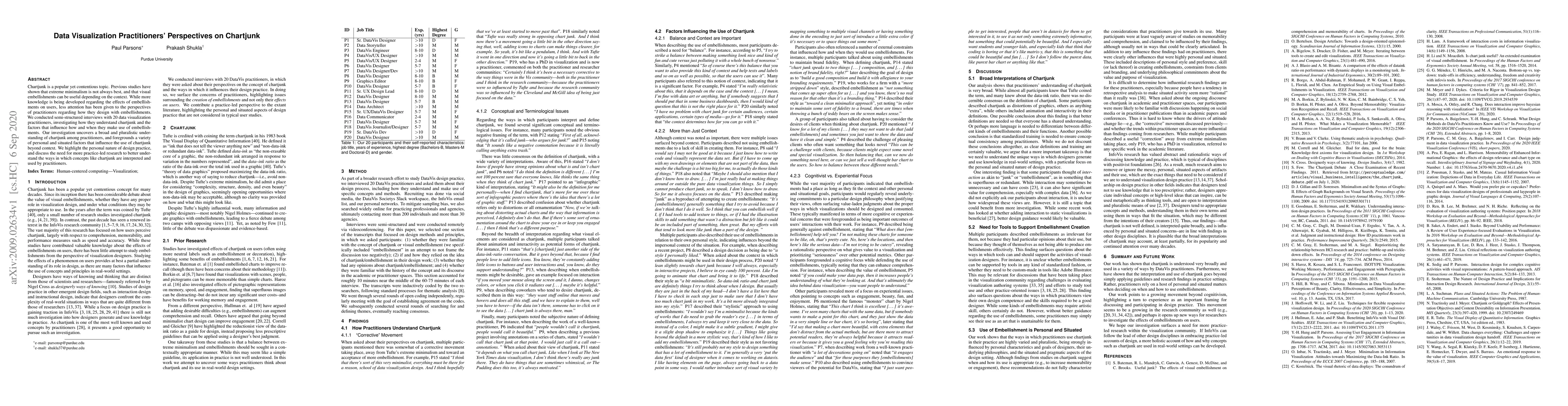 This paper explores the perspectives of data visualization practitioners on chartjunk, revealing diverse understandings and influences on their use of visual embellishments. The study emphasizes the personal and contextual factors that shape practitioners' design decisions, advocating for more practice-led research to better grasp how such concepts are interpreted and applied.