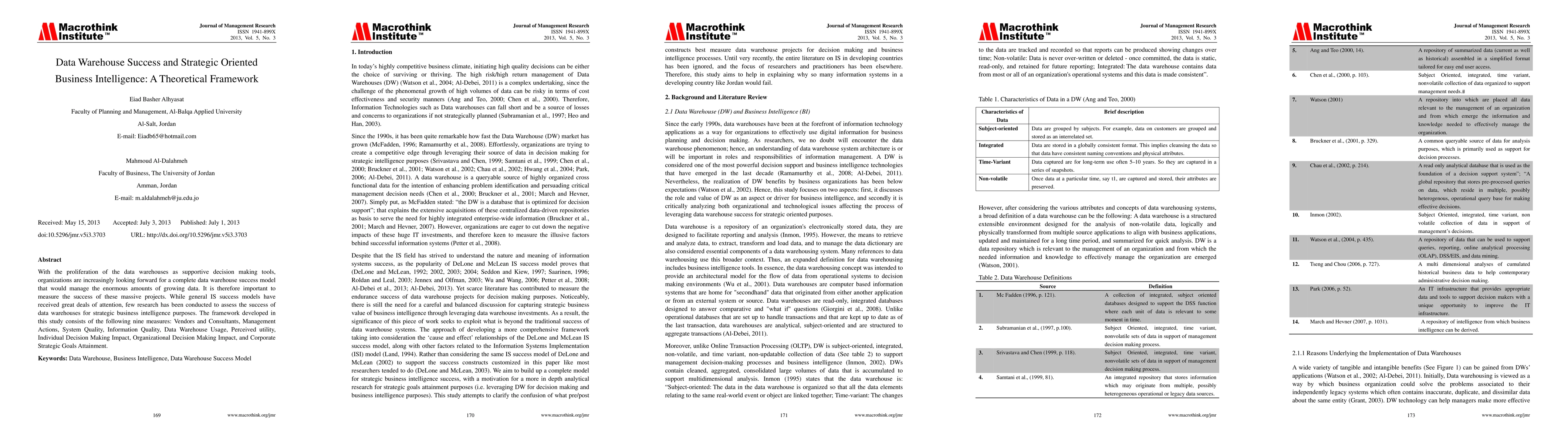 This paper proposes a theoretical framework to measure the success of data warehouses in supporting strategic business intelligence, incorporating nine measures: Vendors and Consultants, Management Actions, System Quality, Information Quality, Data Warehouse Usage, Perceived Utility, Individual Decision Making Impact, Organizational Decision Making Impact, and Corporate Strategic Goals Attainment. The framework aims to address the lack of specific models for assessing data warehouse success.