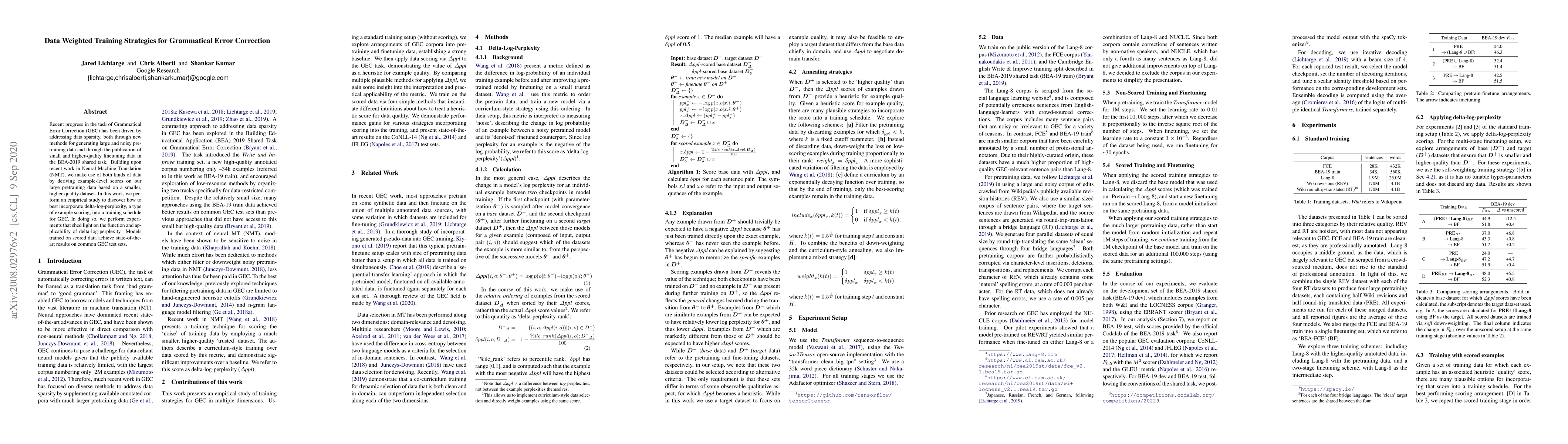 This paper investigates data weighted training strategies for Grammatical Error Correction (GEC) by incorporating delta-log-perplexity scores derived from high-quality finetuning data into large pretraining datasets. The study finds that such weighted training achieves state-of-the-art results on GEC test sets.