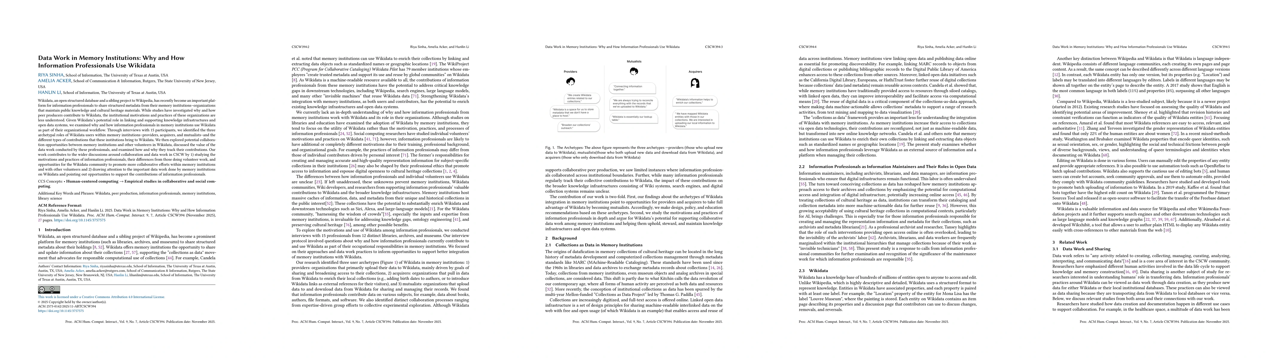 Wikidata, an open structured database and a sibling project to Wikipedia, has recently become an important platform for information professionals to share structured metadata from their memory institutions, organizations that maintain public knowledge and cultural heritage materials. While studies have investigated why and how peer producers contribute to Wikidata, the institutional motivations and practices of these organizations are less understood. Given Wikidata's potential role in linking and supporting knowledge infrastructures and open data systems, we examined why and how information professionals in memory institutions use Wikidata as part of their organizational workflow. Through interviews with 15 participants, we identified the three archetypal roles of Wikidata users within memory institutions, providers, acquirers, and mutualists, and the different types of contributions that these institutions bring to Wikidata. We then explored potential collaboration opportunities between memory institutions and other volunteers in Wikidata, discussed the value of the data work conducted by these professionals, and examined how and why they track their contributions. Our work contributes to the wider discussions around collaboration and data work in CSCW by (1) studying the motivations and practices of information professionals, their differences from those doing volunteer work, and opportunities for the Wikidata community to promote more collaborative efforts within memory institutions and with other volunteers and (2) drawing attention to the important data work done by memory institutions on Wikidata and pointing out opportunities to support the contributions of information professionals.