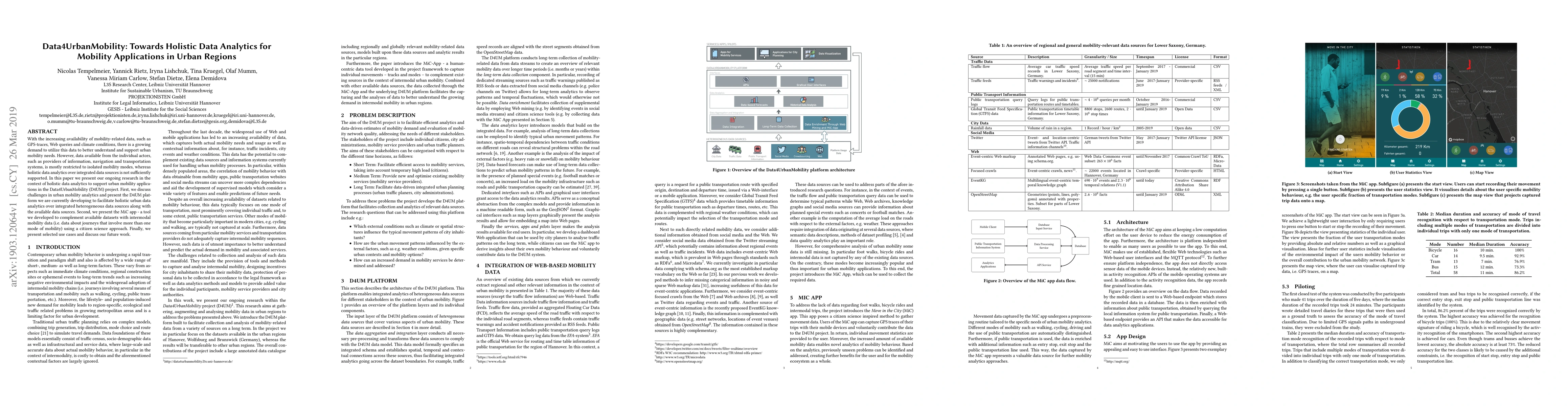 The paper discusses the challenges in urban mobility analytics and introduces the Data4UrbanMobility (D4UM) project, which aims to develop a platform for holistic data analytics using integrated heterogeneous data sources. It also presents the MiC app, a tool for collecting intermodal mobility data through citizen science.