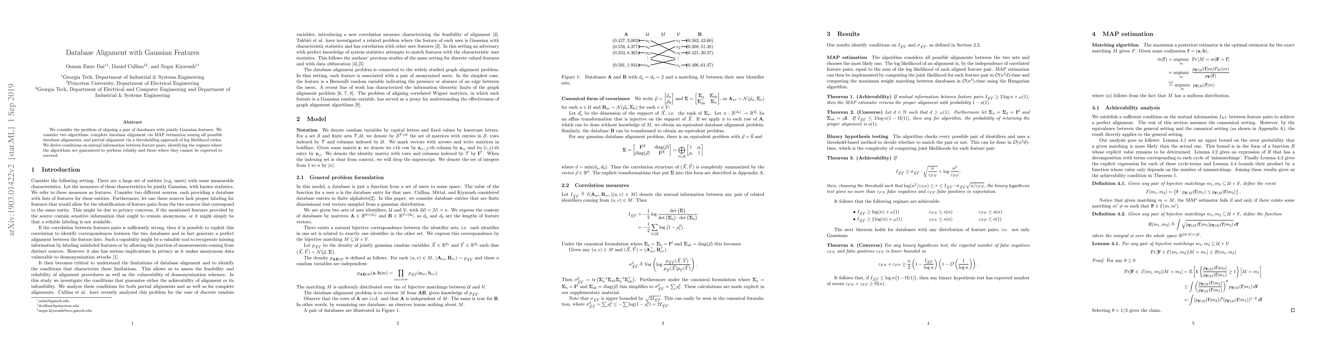 We consider the problem of aligning a pair of databases with jointly Gaussian features. We consider two algorithms, complete database alignment via MAP estimation among all possible database alignments, and partial alignment via a thresholding approach of log likelihood ratios. We derive conditions on mutual information between feature pairs, identifying the regimes where the algorithms are guaranteed to perform reliably and those where they cannot be expected to succeed.