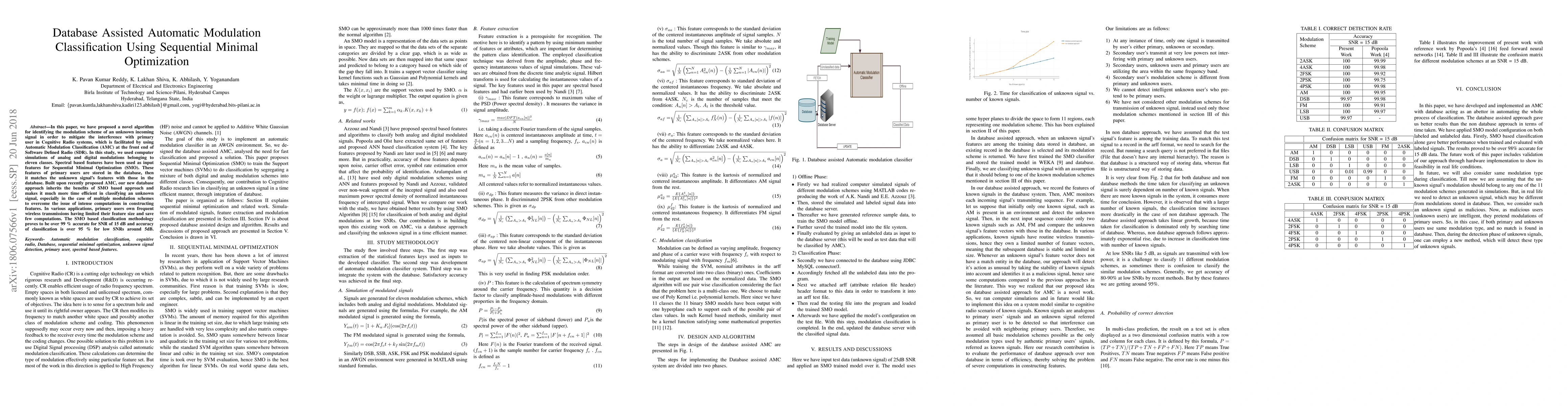 In this paper, we have proposed a novel algorithm for identifying the modulation scheme of an unknown incoming signal in order to mitigate the interference with primary user in Cognitive Radio systems, which is facilitated by using Automatic Modulation Classification (AMC) at the front end of Software Defined Radio (SDR). In this study, we used computer simulations of analog and digital modulations belonging to eleven classes. Spectral based features have been used as input features for Sequential Minimal Optimization (SMO). These features of primary users are stored in the database, then it matches the unknown signal's features with those in the database. Built upon recently proposed AMC, our new database approach inherits the benefits of SMO based approach and makes it much more time efficient in classifying an unknown signal, especially in the case of multiple modulation schemes to overcome the issue of intense computations in constructing features. In various applications, primary users own frequent wireless transmissions having limited their feature size and save few computations. The SMO based classification methodology proves to be over 99 \% accurate for SNR of 15 dB and accuracy of classification is over 95 \% for low SNRs around 5dB.