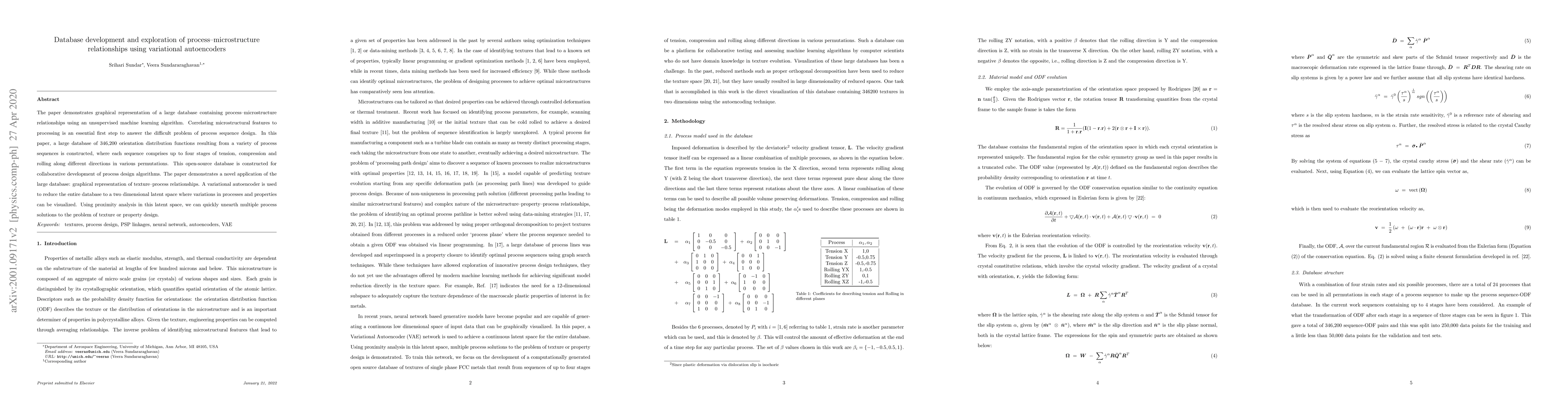 This paper constructs a large database of 346,200 orientation distribution functions from various process sequences and uses a variational autoencoder to visualize relationships between microstructure and processing. The latent space representation aids in identifying multiple process solutions for texture or property design.