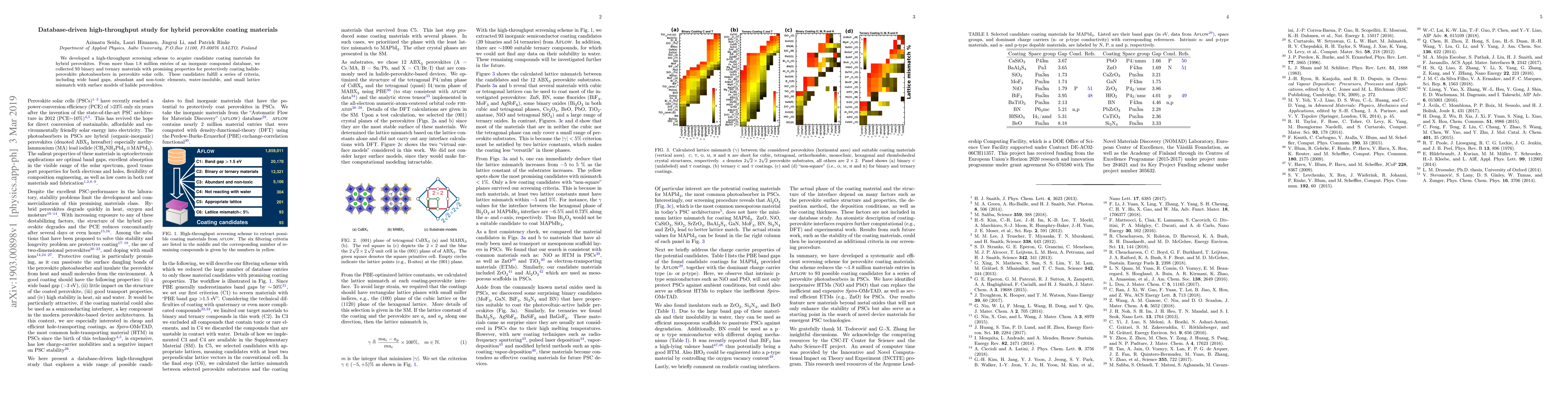 This study developed a high-throughput screening method to identify 93 binary and ternary inorganic compounds from a database of 1.8 million entries as potential coating materials for hybrid perovskites in solar cells, focusing on properties like wide band gaps and low lattice mismatch.