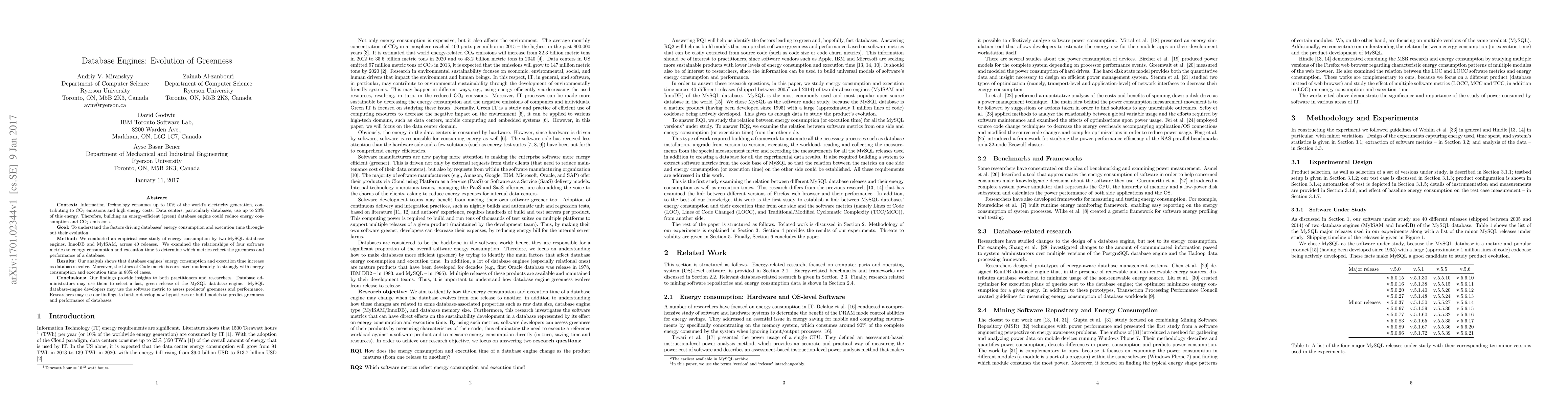 Context: Information Technology consumes up to 10\% of the world's electricity generation, contributing to CO2 emissions and high energy costs. Data centers, particularly databases, use up to 23% of this energy. Therefore, building an energy-efficient (green) database engine could reduce energy consumption and CO2 emissions. Goal: To understand the factors driving databases' energy consumption and execution time throughout their evolution. Method: We conducted an empirical case study of energy consumption by two MySQL database engines, InnoDB and MyISAM, across 40 releases. We examined the relationships of four software metrics to energy consumption and execution time to determine which metrics reflect the greenness and performance of a database. Results: Our analysis shows that database engines' energy consumption and execution time increase as databases evolve. Moreover, the Lines of Code metric is correlated moderately to strongly with energy consumption and execution time in 88% of cases. Conclusions: Our findings provide insights to both practitioners and researchers. Database administrators may use them to select a fast, green release of the MySQL database engine. MySQL database-engine developers may use the software metric to assess products' greenness and performance. Researchers may use our findings to further develop new hypotheses or build models to predict greenness and performance of databases.