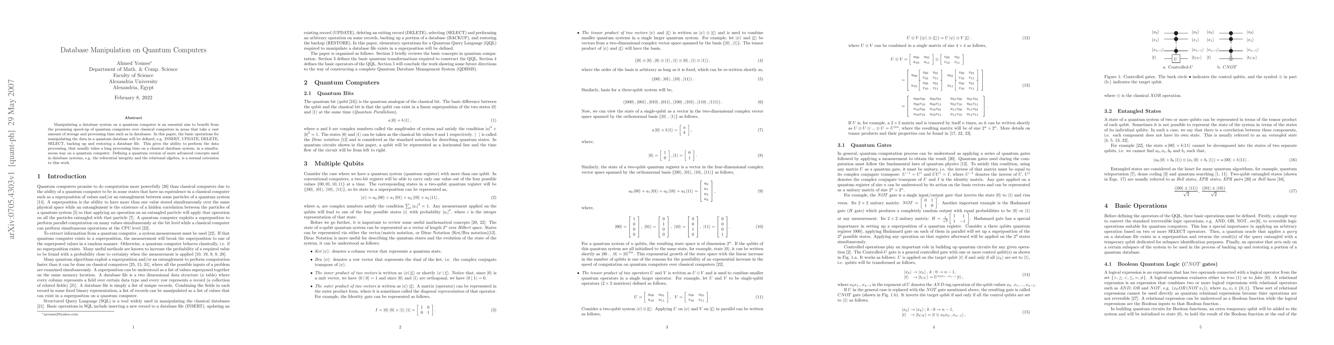 This paper explores the fundamental operations for manipulating data in a quantum database, including INSERT, UPDATE, DELETE, SELECT, and database file backup and restore. It aims to leverage quantum computing's speed to perform extensive data processing tasks more efficiently than classical systems.