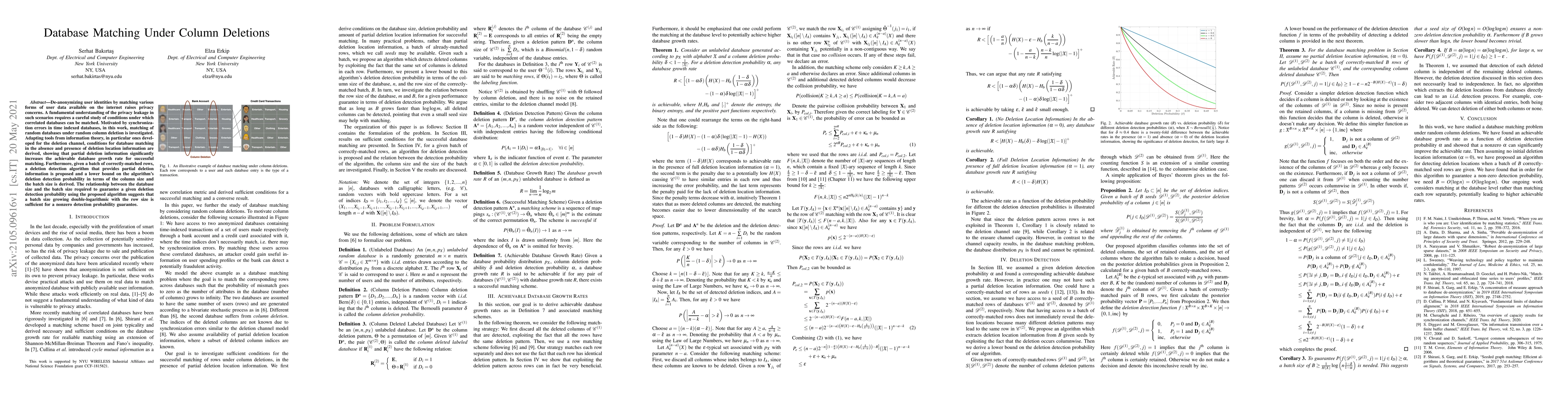This paper investigates the conditions under which databases can be matched when columns are randomly deleted, using tools from information theory. It finds that partial deletion location information significantly enhances matching success and proposes a deletion detection algorithm that requires a batch size growing double-logarithmically with the row size for a nonzero detection probability.