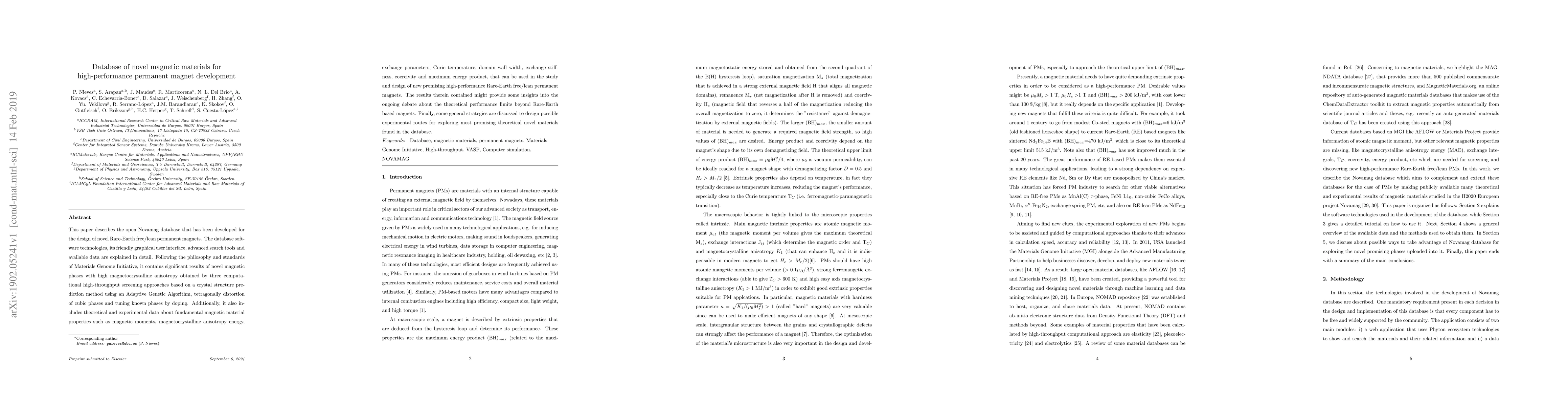 This paper describes the open Novamag database that has been developed for the design of novel Rare-Earth free/lean permanent magnets. The database software technologies, its friendly graphical user interface, advanced search tools and available data are explained in detail. Following the philosophy and standards of Materials Genome Initiative, it contains significant results of novel magnetic phases with high magnetocrystalline anisotropy obtained by three computational high-throughput screening approaches based on a crystal structure prediction method using an Adaptive Genetic Algorithm, tetragonally distortion of cubic phases and tuning known phases by doping. Additionally, it also includes theoretical and experimental data about fundamental magnetic material properties such as magnetic moments, magnetocrystalline anisotropy energy, exchange parameters, Curie temperature, domain wall width, exchange stiffness, coercivity and maximum energy product, that can be used in the study and design of new promising high-performance Rare-Earth free/lean permanent magnets. The results therein contained might provide some insights into the ongoing debate about the theoretical performance limits beyond Rare-Earth based magnets. Finally, some general strategies are discussed to design possible experimental routes for exploring most promising theoretical novel materials found in the database.