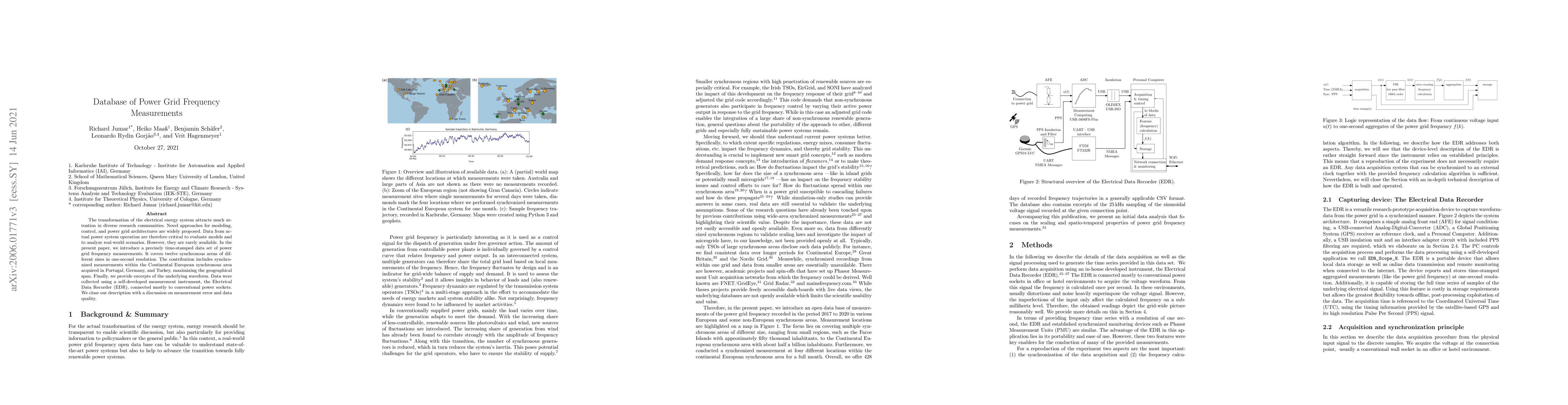 The transformation of the electrical energy system attracts much attention in diverse research communities. Novel approaches for modeling, control, and power grid architectures are widely proposed. Data from actual power system operation are therefore critical to evaluate models and to analyze real-world scenarios. However, they are rarely available. In the present paper, we introduce a precisely time-stamped data set of power grid frequency measurements. It covers twelve synchronous areas of different sizes in one-second resolution. The contribution includes synchronized measurements within the Continental European synchronous area acquired in Portugal, Germany, and Turkey, maximizing the geographical span. Finally, we provide excerpts of the underlying waveform. Data were collected using a self-developed measurement instrument, the Electrical Data Recorder (EDR), connected mostly to conventional power sockets. We close our description with a discussion on measurement error and data quality.