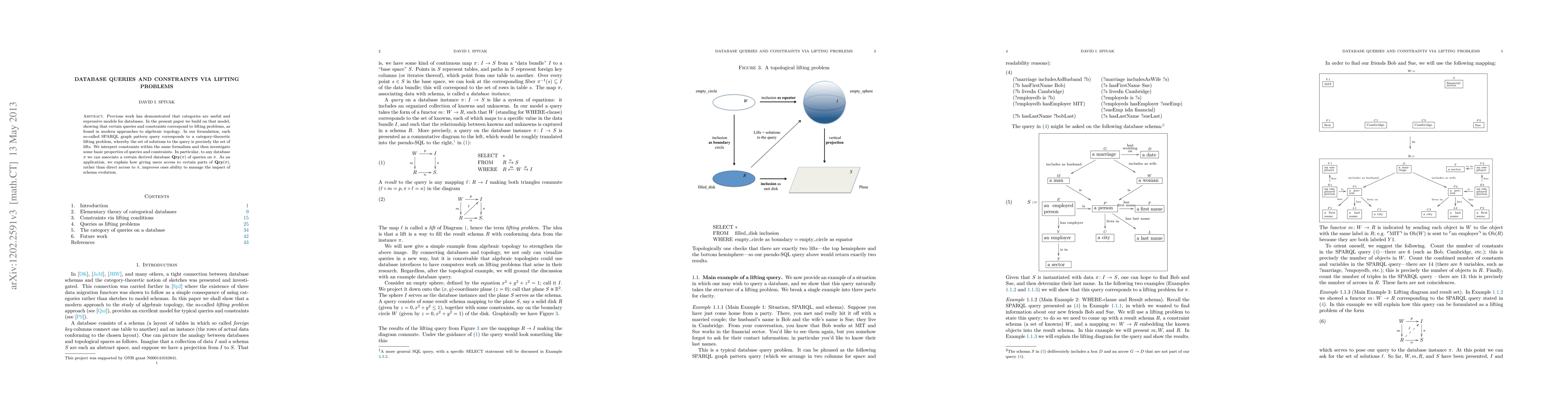 This paper demonstrates that database queries and constraints can be modeled as lifting problems in category theory, specifically relating SPARQL graph pattern queries to category-theoretic lifting problems. It explores how this approach can manage schema evolution by providing users access to derived databases of queries rather than direct access to the original database.