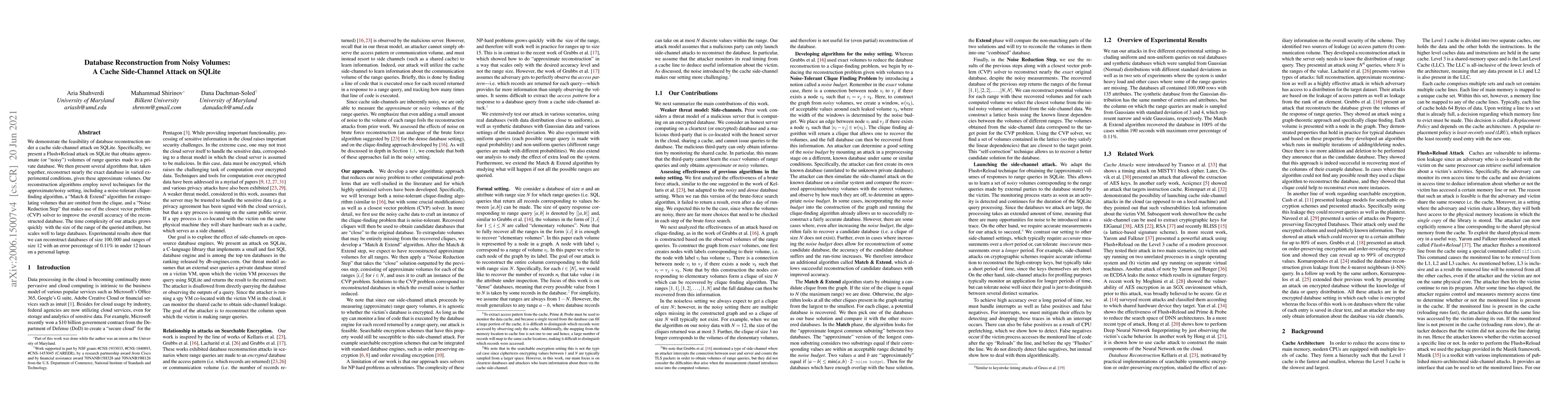 This paper demonstrates a cache side-channel attack on SQLite to reconstruct private databases using noisy volumes of range queries. It introduces a Flush+Reload attack and presents algorithms for accurate database reconstruction, including a noise-tolerant clique-finding and a "Match & Extend" method, achieving a 0.11% error rate on databases of size 100,000.