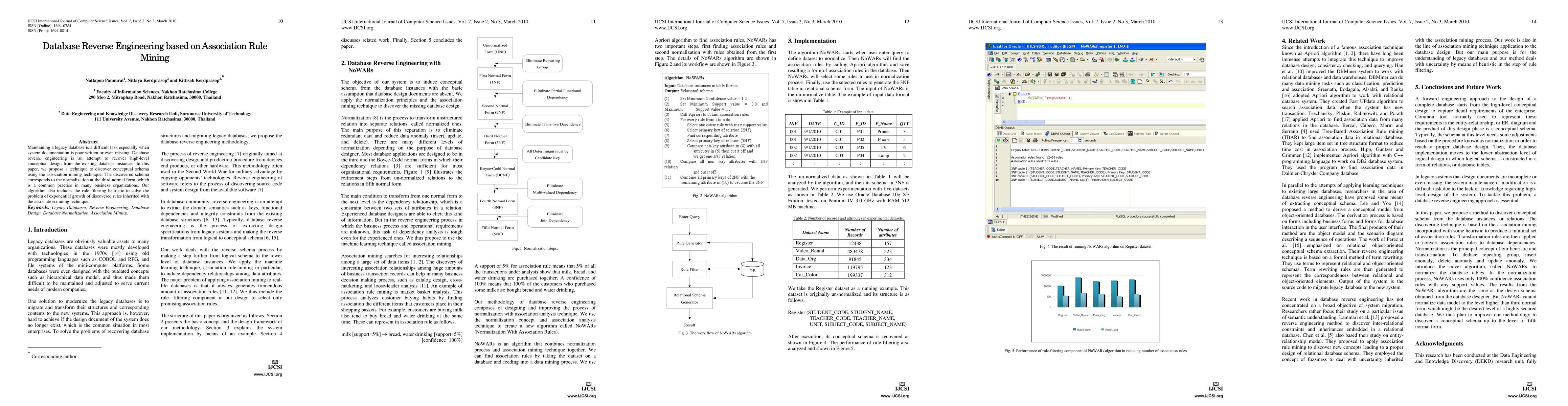 This paper proposes a technique for database reverse engineering using association rule mining to recover high-level conceptual design from legacy databases. The method discovers schemas normalized to the third normal form and includes a rule filtering heuristic to manage the exponential growth of rules.