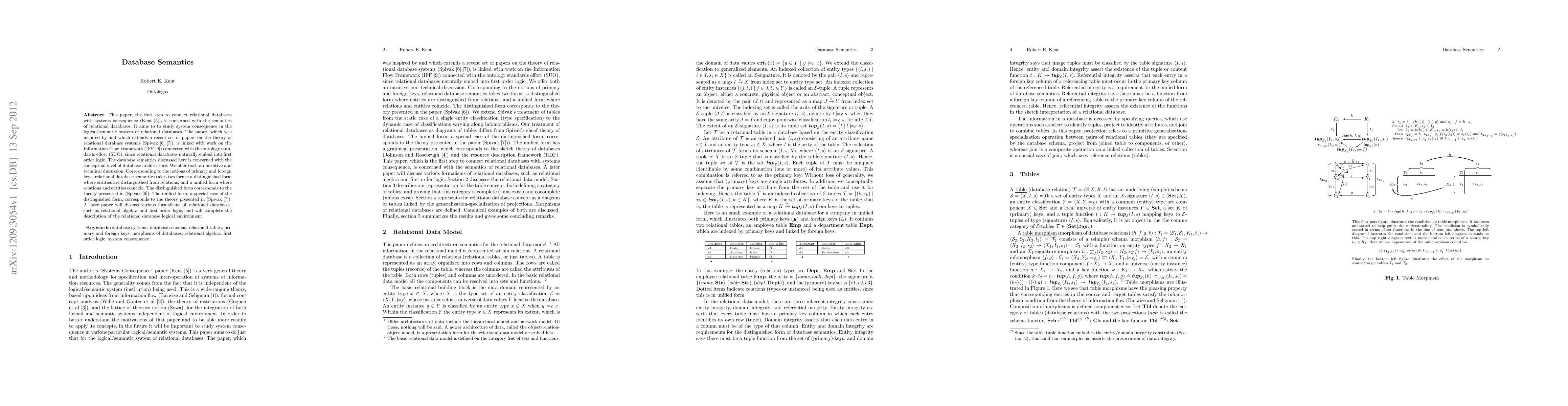 This paper, the first step to connect relational databases with systems consequence (Kent: "System Consequence" 2009), is concerned with the semantics of relational databases. It aims to to study system consequence in the logical/semantic system of relational databases. The paper, which was inspired by and which extends a recent set of papers on the theory of relational database systems (Spivak: "Functorial Data Migration" 2012), is linked with work on the Information Flow Framework (IFF) [http://suo.ieee.org/IFF/] connected with the ontology standards effort (SUO), since relational databases naturally embed into first order logic. The database semantics discussed here is concerned with the conceptual level of database architecture. We offer both an intuitive and technical discussion. Corresponding to the notions of primary and foreign keys, relational database semantics takes two forms: a distinguished form where entities are distinguished from relations, and a unified form where relations and entities coincide. The distinguished form corresponds to the theory presented in (Spivak: "Simplicial databases" 2009)[arXiv:0904.2012]. The unified form, a special case of the distinguished form, corresponds to the theory presented in (Spivak: "Functorial Data Migration" 2012). A later paper will discuss various formalisms of relational databases, such as relational algebra and first order logic, and will complete the description of the relational database logical environment.