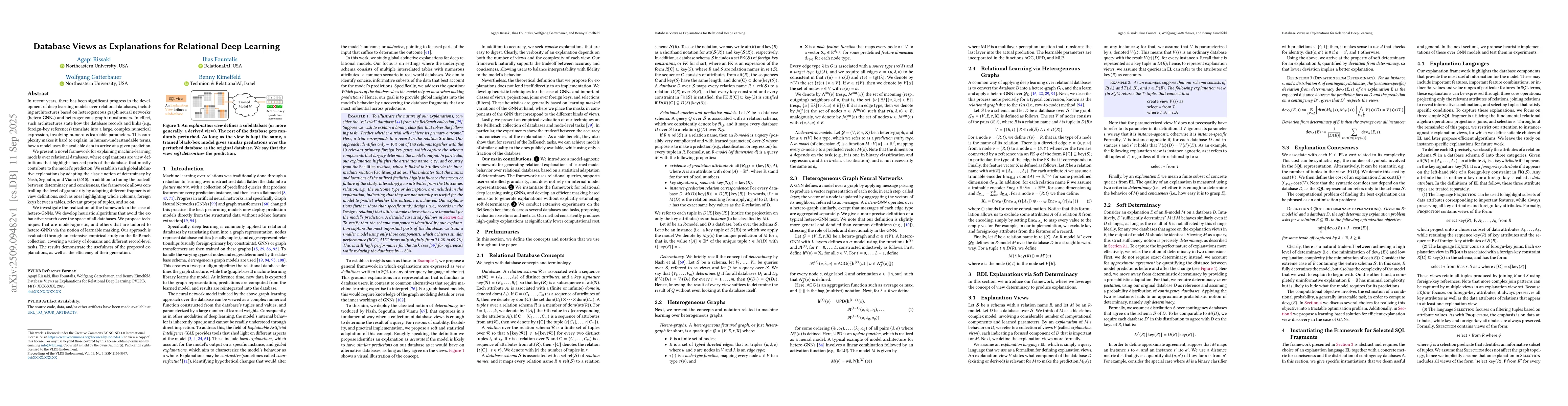 In recent years, there has been significant progress in the development of deep learning models over relational databases, including architectures based on heterogeneous graph neural networks (hetero-GNNs) and heterogeneous graph transformers. In effect, such architectures state how the database records and links (e.g., foreign-key references) translate into a large, complex numerical expression, involving numerous learnable parameters. This complexity makes it hard to explain, in human-understandable terms, how a model uses the available data to arrive at a given prediction. We present a novel framework for explaining machine-learning models over relational databases, where explanations are view definitions that highlight focused parts of the database that mostly contribute to the model's prediction. We establish such global abductive explanations by adapting the classic notion of determinacy by Nash, Segoufin, and Vianu (2010). In addition to tuning the tradeoff between determinacy and conciseness, the framework allows controlling the level of granularity by adopting different fragments of view definitions, such as ones highlighting whole columns, foreign keys between tables, relevant groups of tuples, and so on. We investigate the realization of the framework in the case of hetero-GNNs. We develop heuristic algorithms that avoid the exhaustive search over the space of all databases. We propose techniques that are model-agnostic, and others that are tailored to hetero-GNNs via the notion of learnable masking. Our approach is evaluated through an extensive empirical study on the RelBench collection, covering a variety of domains and different record-level tasks. The results demonstrate the usefulness of the proposed explanations, as well as the efficiency of their generation.