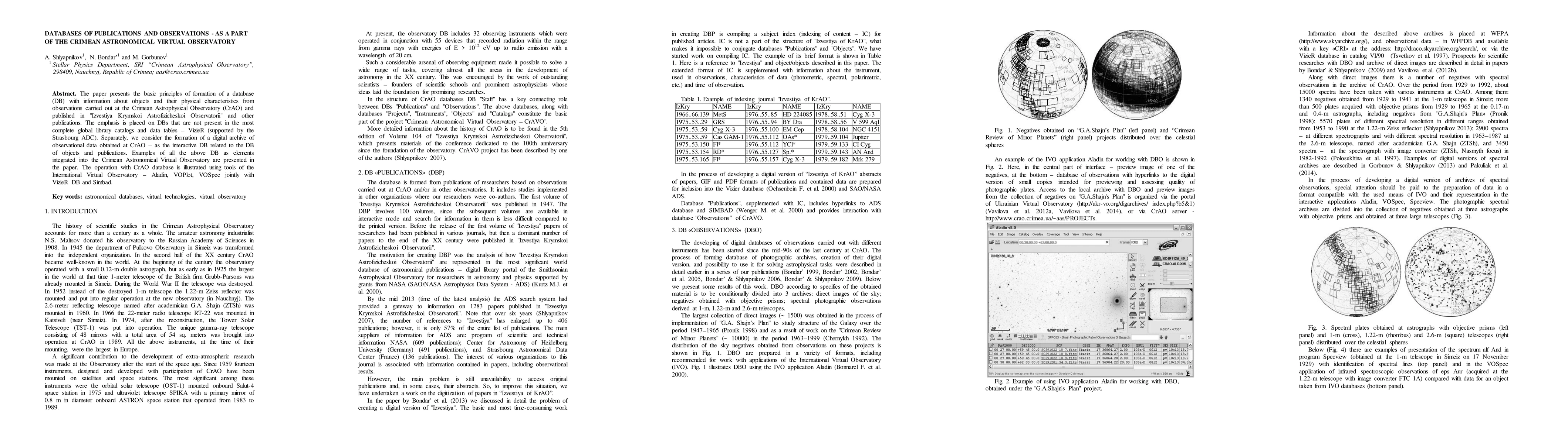 The paper outlines the creation of a specialized database from the Crimean Astrophysical Observatory's observations and publications, emphasizing unique data not found in global catalogs like VizieR. It also discusses the integration of these databases into the Crimean Astronomical Virtual Observatory, using tools like Aladin, VOPlot, and VOSpec.