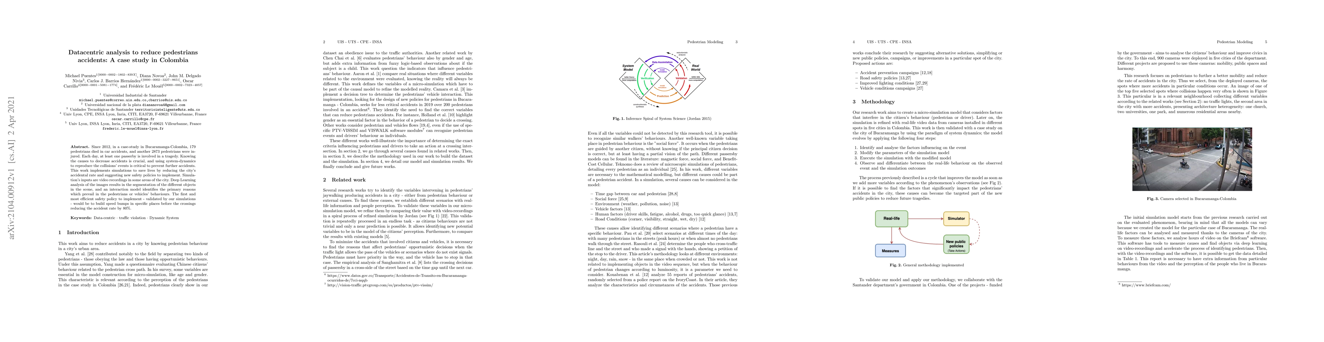 Since 2012, in a case-study in Bucaramanga-Colombia, 179 pedestrians died in car accidents, and another 2873 pedestrians were injured. Each day, at least one passerby is involved in a tragedy. Knowing the causes to decrease accidents is crucial, and using system-dynamics to reproduce the collisions' events is critical to prevent further accidents. This work implements simulations to save lives by reducing the city's accidental rate and suggesting new safety policies to implement. Simulation's inputs are video recordings in some areas of the city. Deep Learning analysis of the images results in the segmentation of the different objects in the scene, and an interaction model identifies the primary reasons which prevail in the pedestrians or vehicles' behaviours. The first and most efficient safety policy to implement-validated by our simulations-would be to build speed bumps in specific places before the crossings reducing the accident rate by 80%.