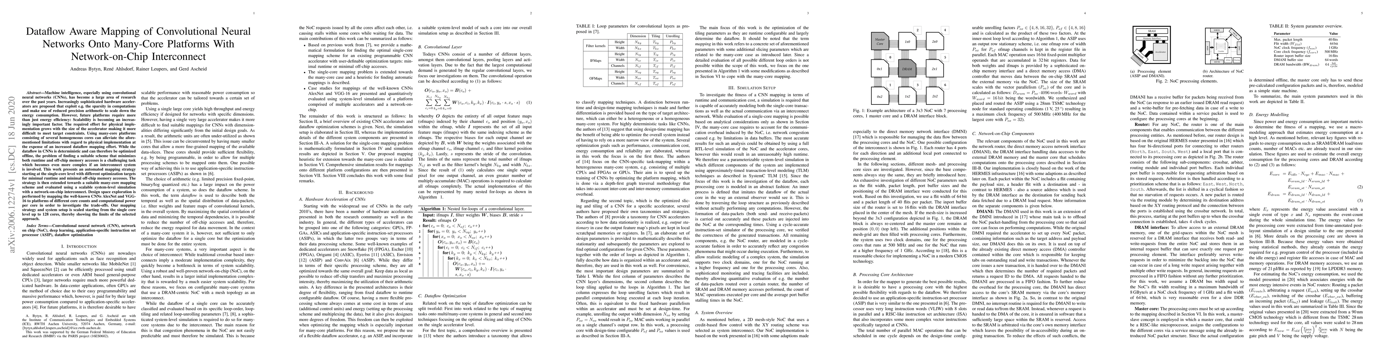 Machine intelligence, especially using convolutional neural networks (CNNs), has become a large area of research over the past years. Increasingly sophisticated hardware accelerators are proposed that exploit e.g. the sparsity in computations and make use of reduced precision arithmetic to scale down the energy consumption. However, future platforms require more than just energy efficiency: Scalability is becoming an increasingly important factor. The required effort for physical implementation grows with the size of the accelerator making it more difficult to meet target constraints. Using many-core platforms consisting of several homogeneous cores can alleviate the aforementioned limitations with regard to physical implementation at the expense of an increased dataflow mapping effort. While the dataflow in CNNs is deterministic and can therefore be optimized offline, the problem of finding a suitable scheme that minimizes both runtime and off-chip memory accesses is a challenging task which becomes even more complex if an interconnect system is involved. This work presents an automated mapping strategy starting at the single-core level with different optimization targets for minimal runtime and minimal off-chip memory accesses. The strategy is then extended towards a suitable many-core mapping scheme and evaluated using a scalable system-level simulation with a network-on-chip interconnect. Design space exploration is performed by mapping the well-known CNNs AlexNet and VGG-16 to platforms of different core counts and computational power per core in order to investigate the trade-offs. Our mapping strategy and system setup is scaled starting from the single core level up to 128 cores, thereby showing the limits of the selected approach.