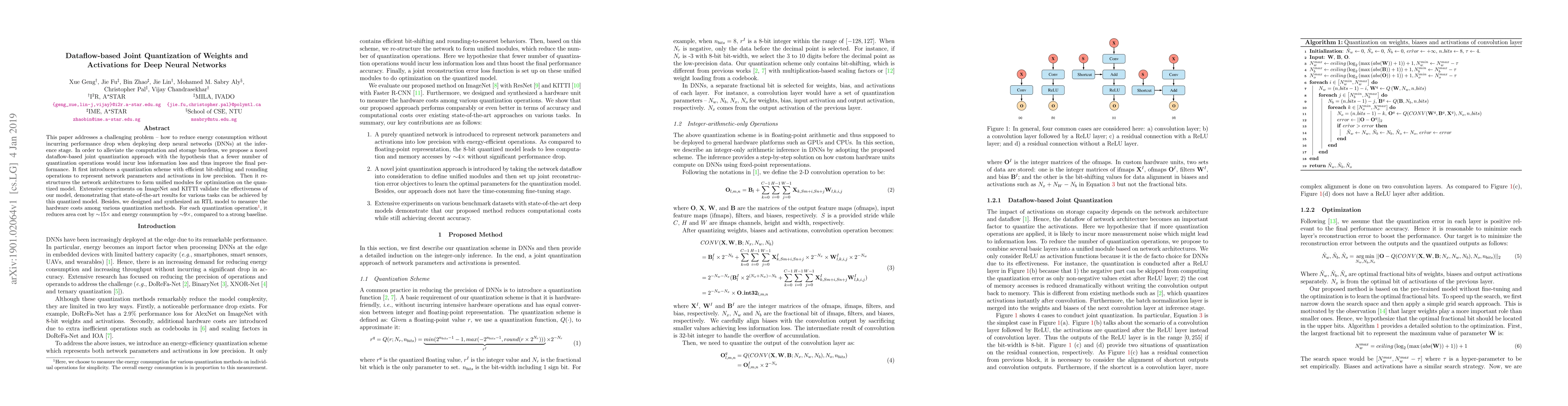 This paper proposes a dataflow-based joint quantization method to reduce energy consumption in deep neural networks without performance loss, achieving state-of-the-art results on ImageNet and KITTI while significantly lowering hardware costs. The approach optimizes both weights and activations through efficient bit-shifting and rounding, restructuring network architectures for better quantization.