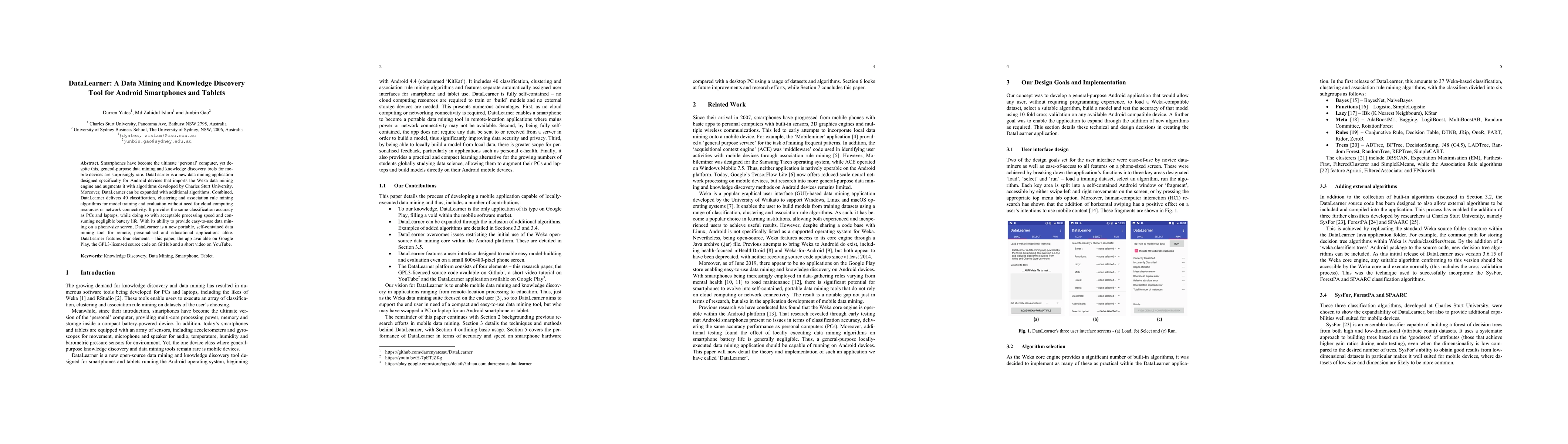 DataLearner is a specialized data-mining application for Android devices that integrates the Weka engine and custom algorithms, offering 40 data-mining tools without requiring cloud resources or network connectivity. It provides comparable classification accuracy to PCs while maintaining efficient processing speed and low battery usage.