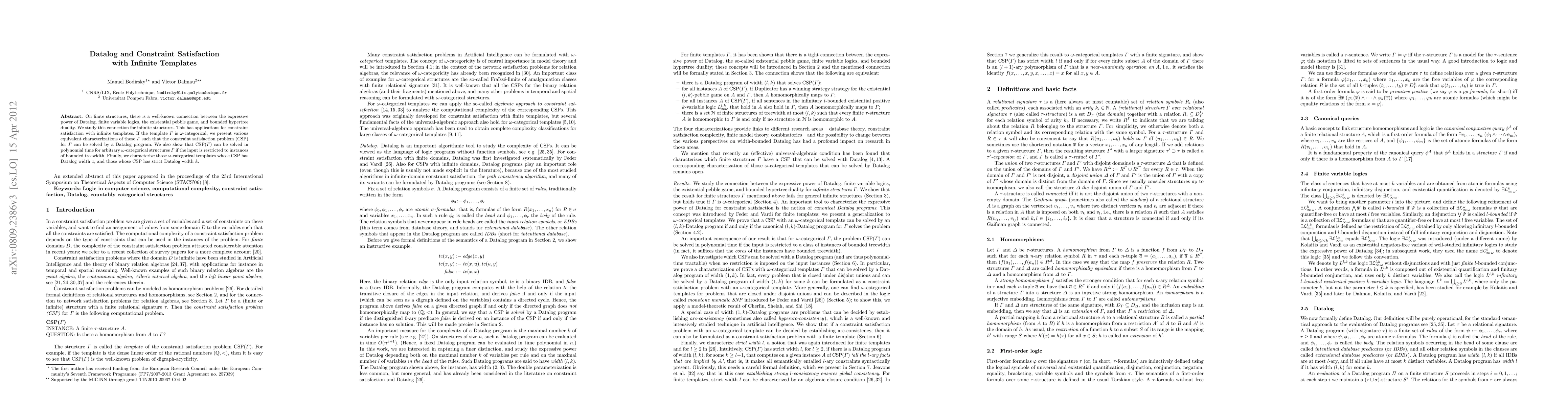This paper explores the connection between Datalog and constraint satisfaction on infinite structures, particularly omega-categorical templates. It provides equivalent characterizations for CSP solvable by Datalog and shows that CSP can be solved in polynomial time for bounded treewidth instances of such structures.