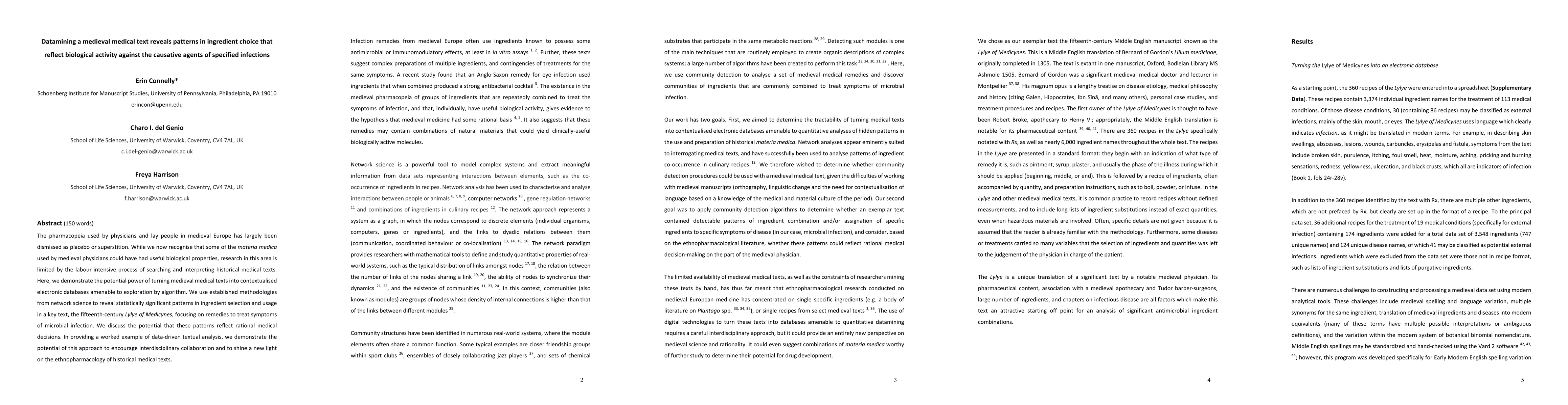 The pharmacopeia used by physicians and lay people in medieval Europe has largely been dismissed as placebo or superstition. While we now recognise that some of the materia medica used by medieval physicians could have had useful biological properties, research in this area is limited by the labour-intensive process of searching and interpreting historical medical texts. Here, we demonstrate the potential power of turning medieval medical texts into contextualised electronic databases amenable to exploration by algorithm. We use established methodologies from network science to reveal statistically significant patterns in ingredient selection and usage in a key text, the fifteenth-century Lylye of Medicynes, focusing on remedies to treat symptoms of microbial infection. We discuss the potential that these patterns reflect rational medical decisions. In providing a worked example of data-driven textual analysis, we demonstrate the potential of this approach to encourage interdisciplinary collaboration and to shine a new light on the ethnopharmacology of historical medical texts.
