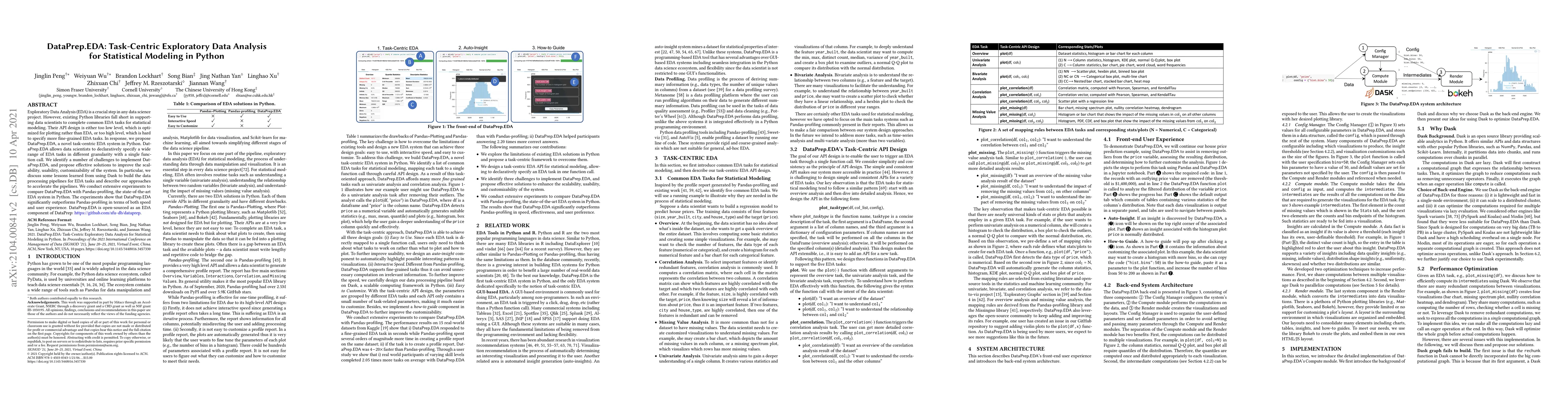 DataPrep.EDA, a task-centric EDA tool built in Python, offers a novel API mapping common EDA tasks in statistical modeling to corresponding statistics and plots, along with tools for automatically generating insights and providing guides.