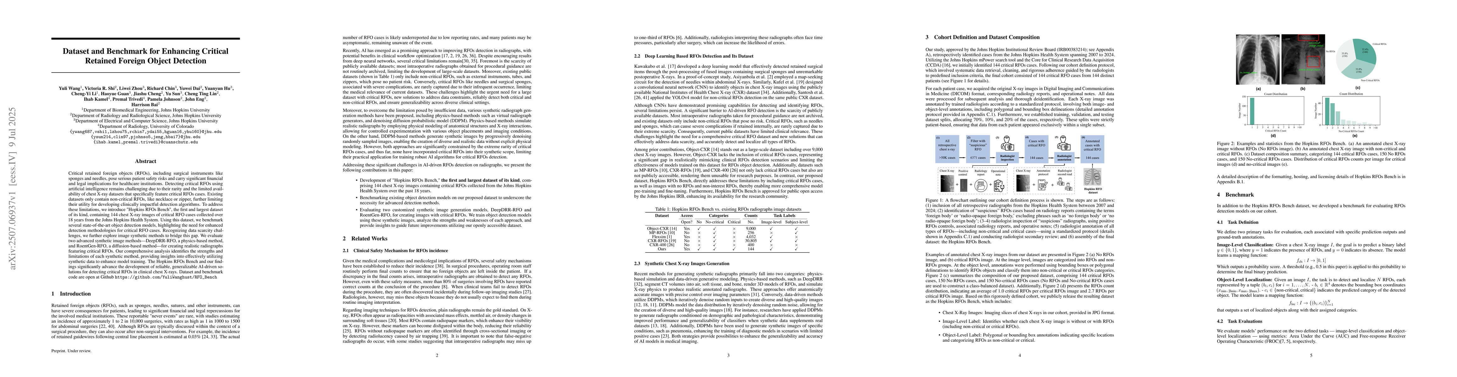 Critical retained foreign objects (RFOs), including surgical instruments like sponges and needles, pose serious patient safety risks and carry significant financial and legal implications for healthcare institutions. Detecting critical RFOs using artificial intelligence remains challenging due to their rarity and the limited availability of chest X-ray datasets that specifically feature critical RFOs cases. Existing datasets only contain non-critical RFOs, like necklace or zipper, further limiting their utility for developing clinically impactful detection algorithms. To address these limitations, we introduce "Hopkins RFOs Bench", the first and largest dataset of its kind, containing 144 chest X-ray images of critical RFO cases collected over 18 years from the Johns Hopkins Health System. Using this dataset, we benchmark several state-of-the-art object detection models, highlighting the need for enhanced detection methodologies for critical RFO cases. Recognizing data scarcity challenges, we further explore image synthetic methods to bridge this gap. We evaluate two advanced synthetic image methods, DeepDRR-RFO, a physics-based method, and RoentGen-RFO, a diffusion-based method, for creating realistic radiographs featuring critical RFOs. Our comprehensive analysis identifies the strengths and limitations of each synthetic method, providing insights into effectively utilizing synthetic data to enhance model training. The Hopkins RFOs Bench and our findings significantly advance the development of reliable, generalizable AI-driven solutions for detecting critical RFOs in clinical chest X-rays.