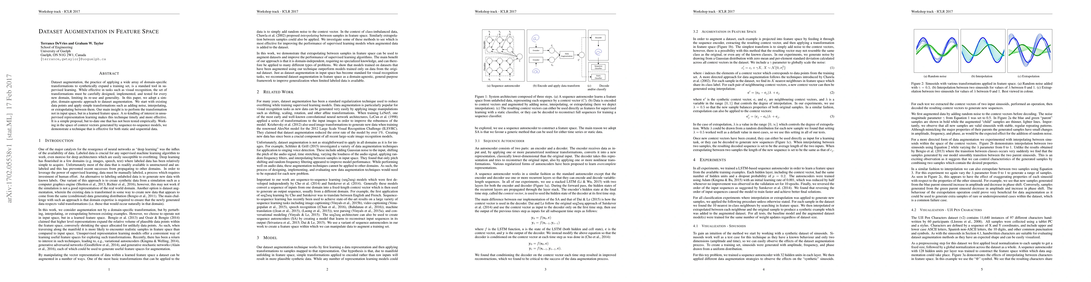 Dataset augmentation, the practice of applying a wide array of domain-specific transformations to synthetically expand a training set, is a standard tool in supervised learning. While effective in tasks such as visual recognition, the set of transformations must be carefully designed, implemented, and tested for every new domain, limiting its re-use and generality. In this paper, we adopt a simpler, domain-agnostic approach to dataset augmentation. We start with existing data points and apply simple transformations such as adding noise, interpolating, or extrapolating between them. Our main insight is to perform the transformation not in input space, but in a learned feature space. A re-kindling of interest in unsupervised representation learning makes this technique timely and more effective. It is a simple proposal, but to-date one that has not been tested empirically. Working in the space of context vectors generated by sequence-to-sequence models, we demonstrate a technique that is effective for both static and sequential data.